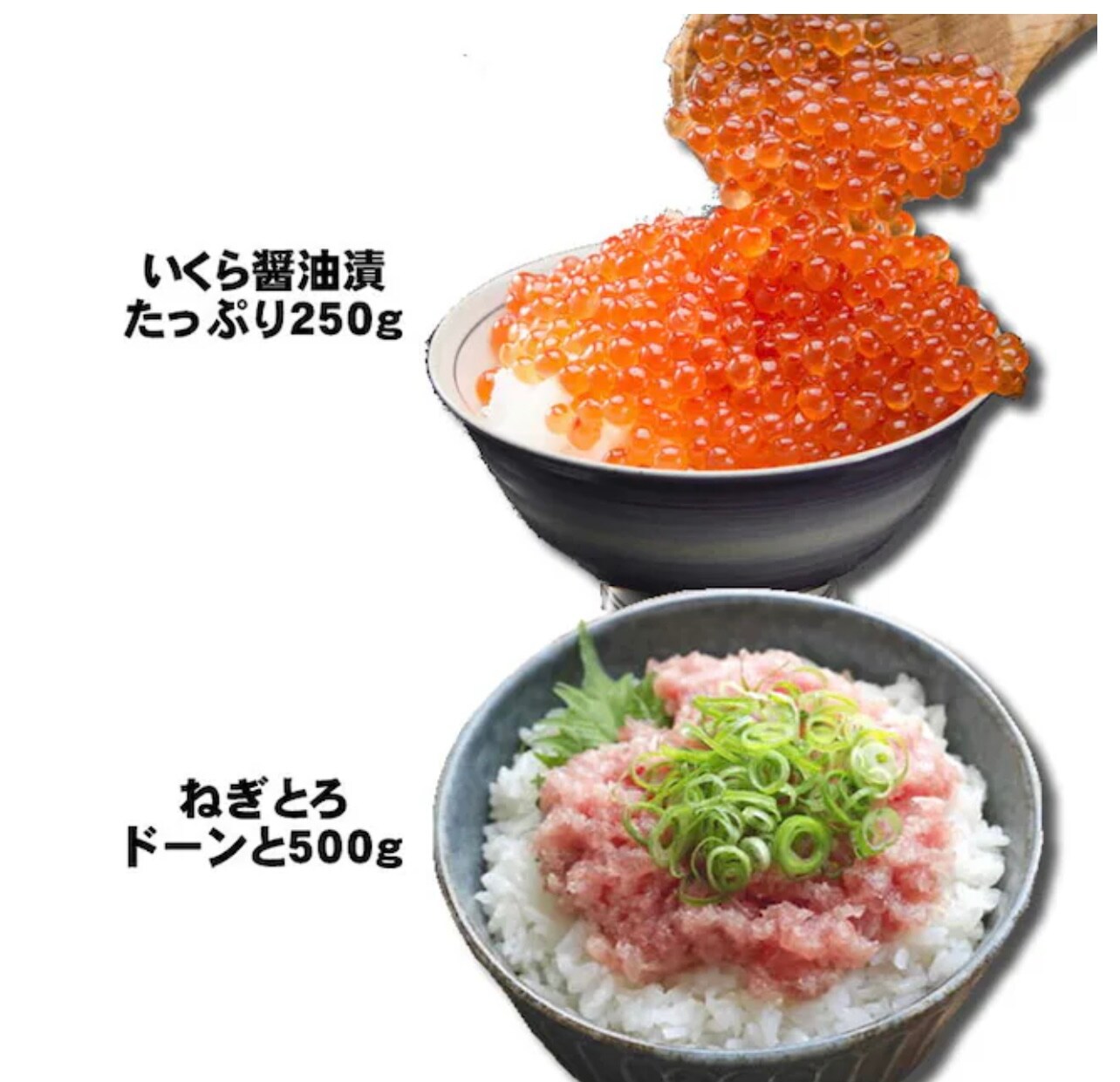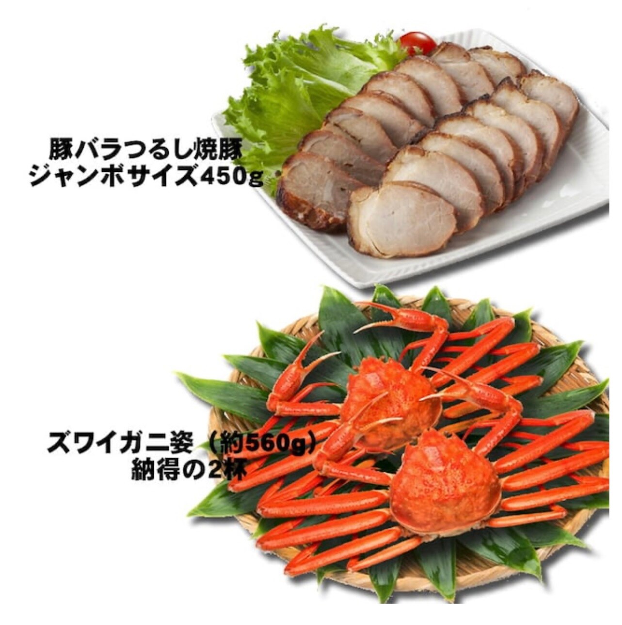 焼豚450g、ズワイガニ2杯、イクラの醤油漬け250g、ネギトロ500g、特大有頭えび7尾、北海道ホタテマリネ350g