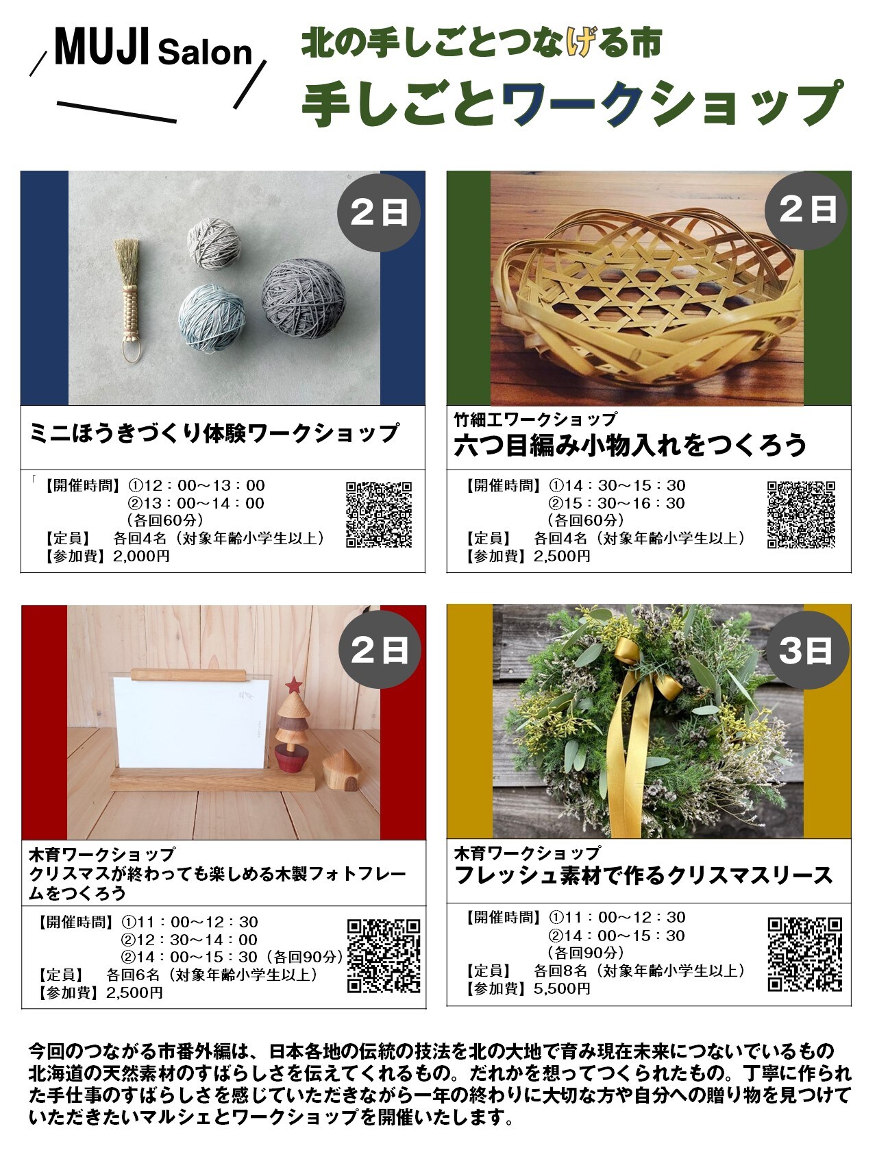 12月2、3日無印良品札幌パルコ店北の手仕事つながる市に出店いたします。他の作家さんの楽しそうなワークショップもありますので、そちらも是非ご参加ください。