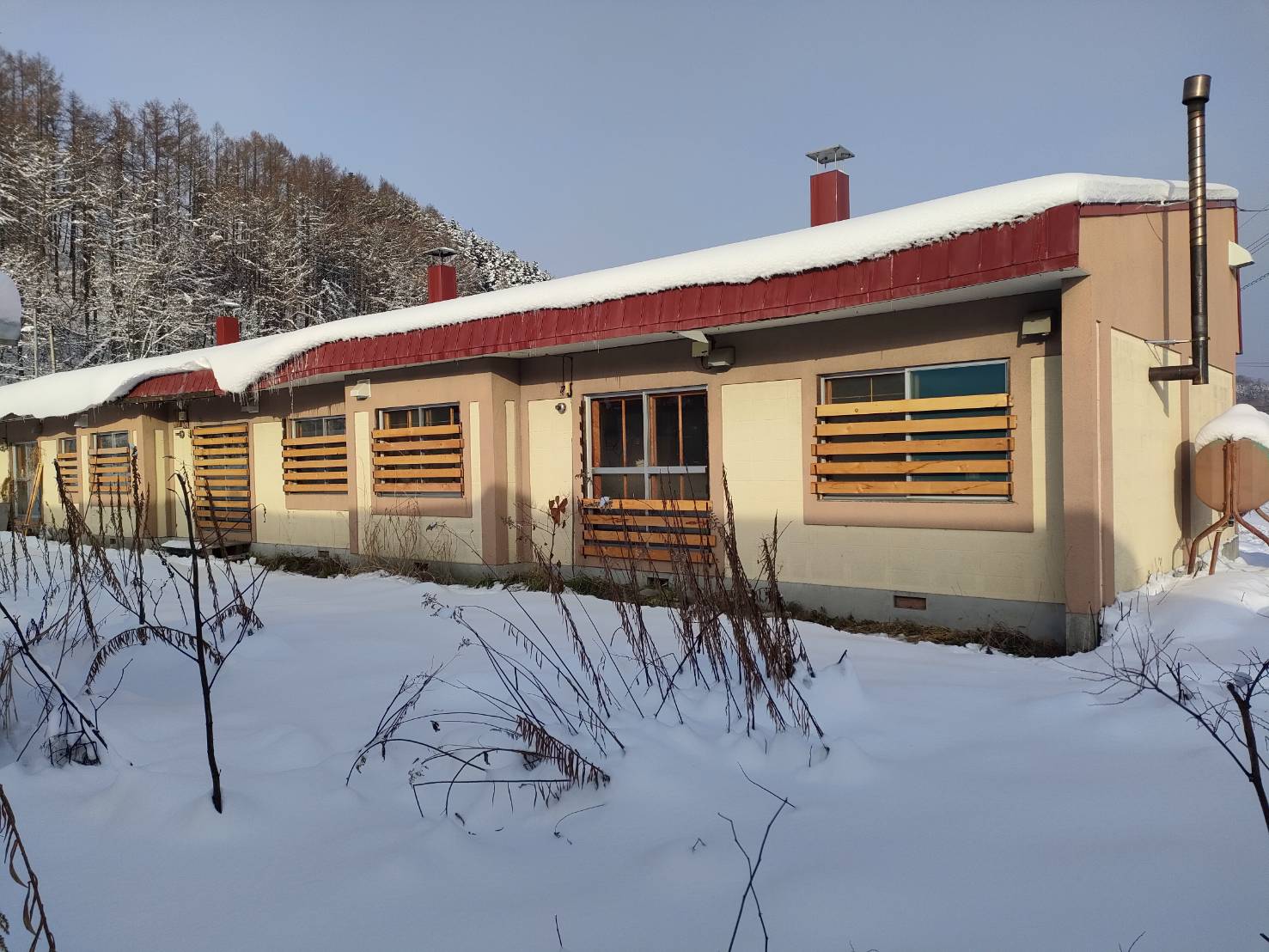 この雪が降り積もって、ほぼ毎冬屋根の上の高さにまでなります。全面に板をはると家の中が真っ暗になるのでこのように。それでも、家の中全体が薄暗くなるので、結構冬は鬱鬱としてしまいます。