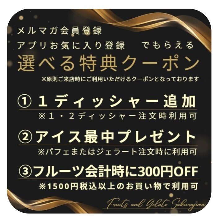 毎回旬でお得なフルーツ&ジェラートの情報が届きます。おまけに、初回登録時に「選べる特典」が付いてきます。