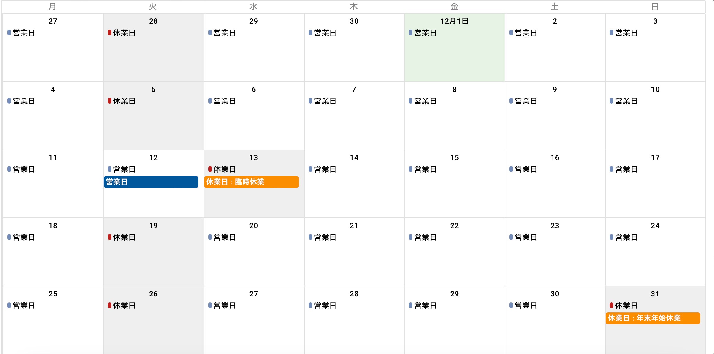 12月12日の火曜日は営業日、13日の水曜日は臨時休業となっていますので、ご注意ください。