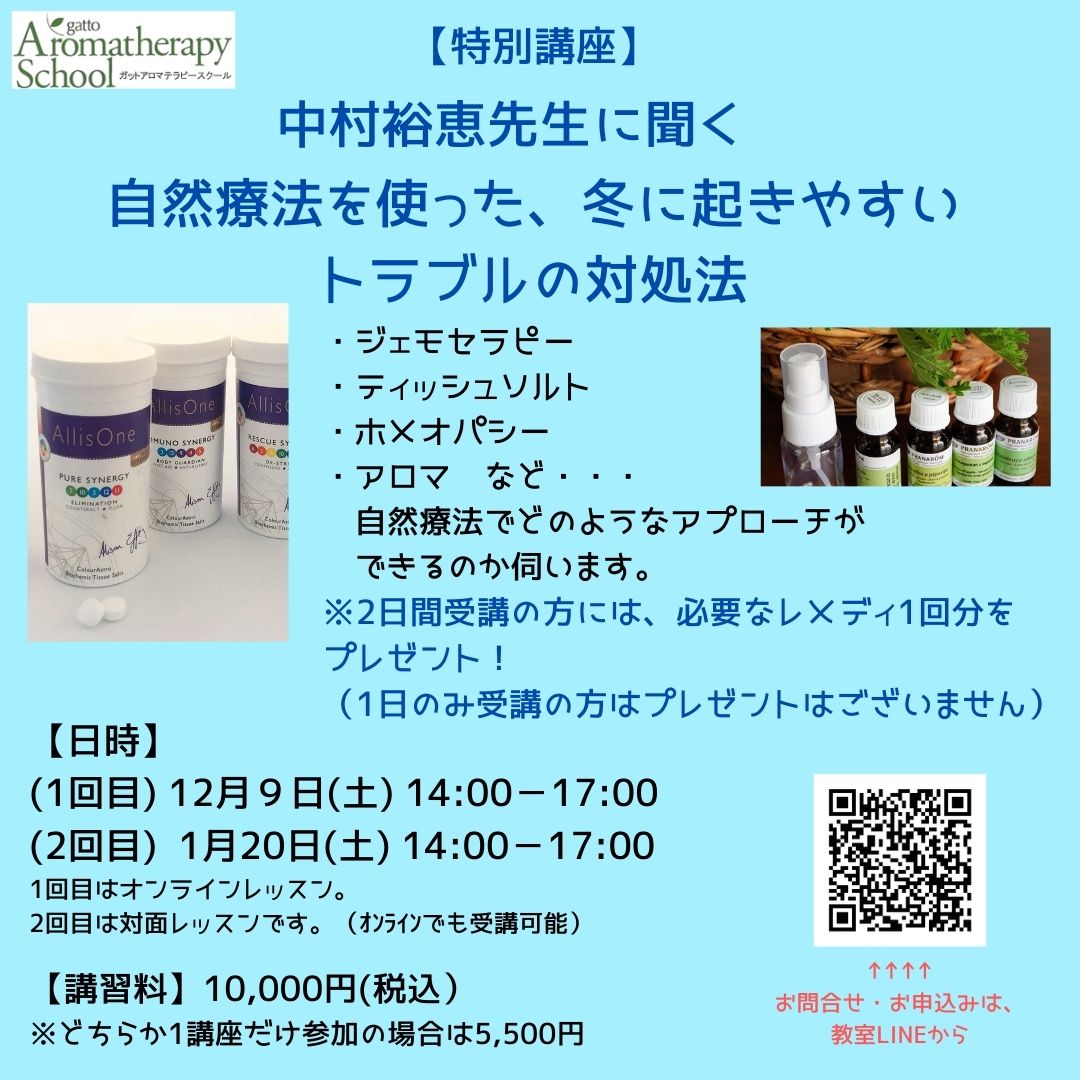ガットアロマテラピースクール主催「自然療法を使った冬に起きやすいトラブルの対処法」オンラインセミナーを12/9(土)午後に行います。お問合せは以下です