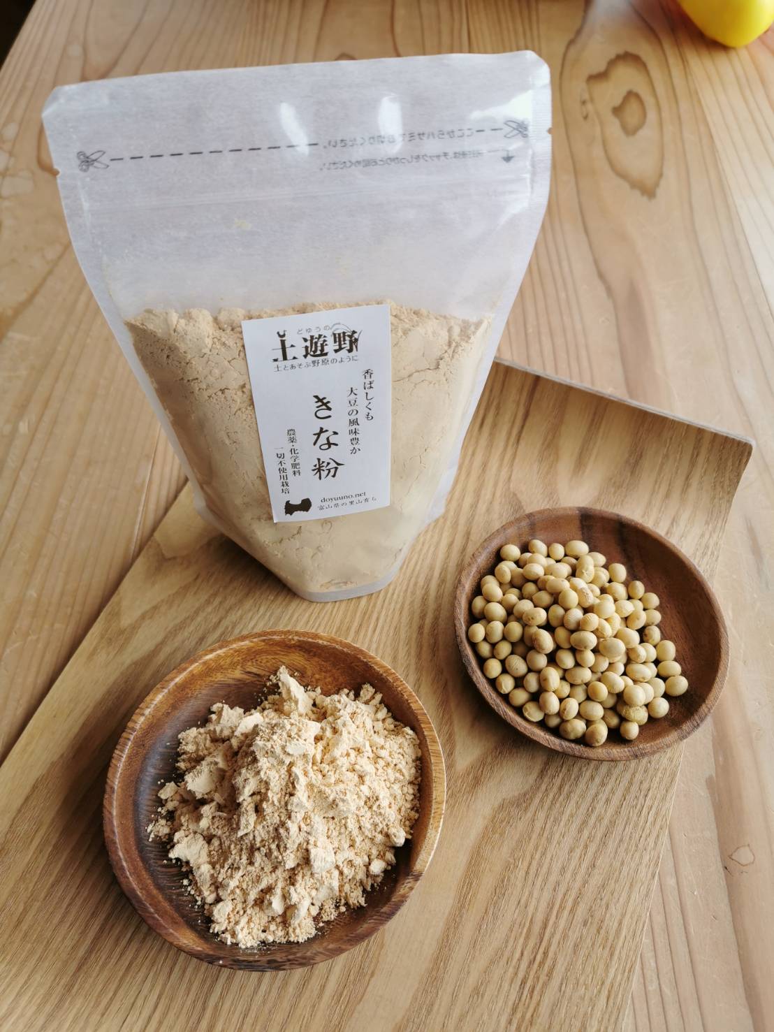 きな粉は、農薬化学肥料を一切使用せずに栽培した艶麗(えんれい)大豆を使用しています。