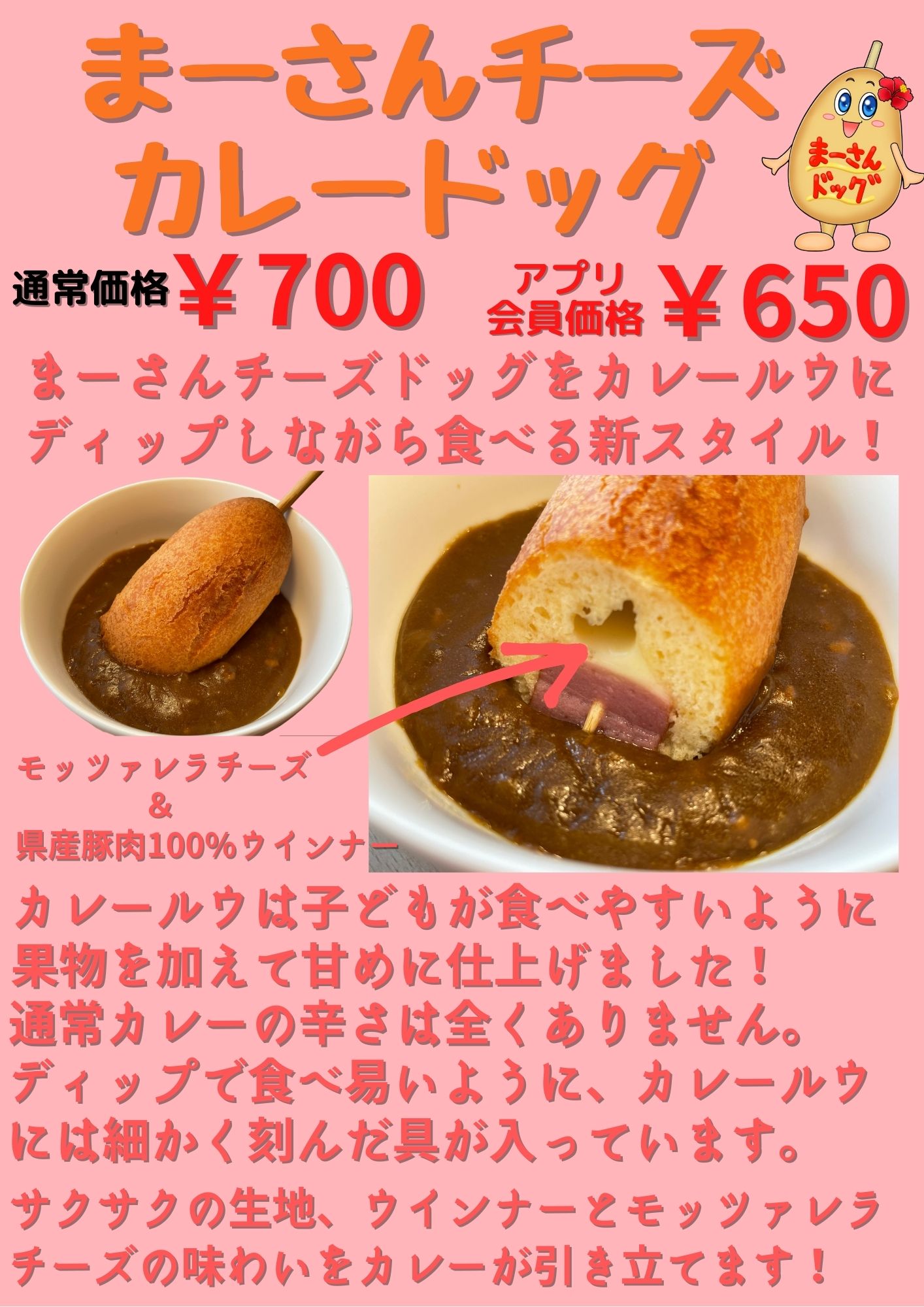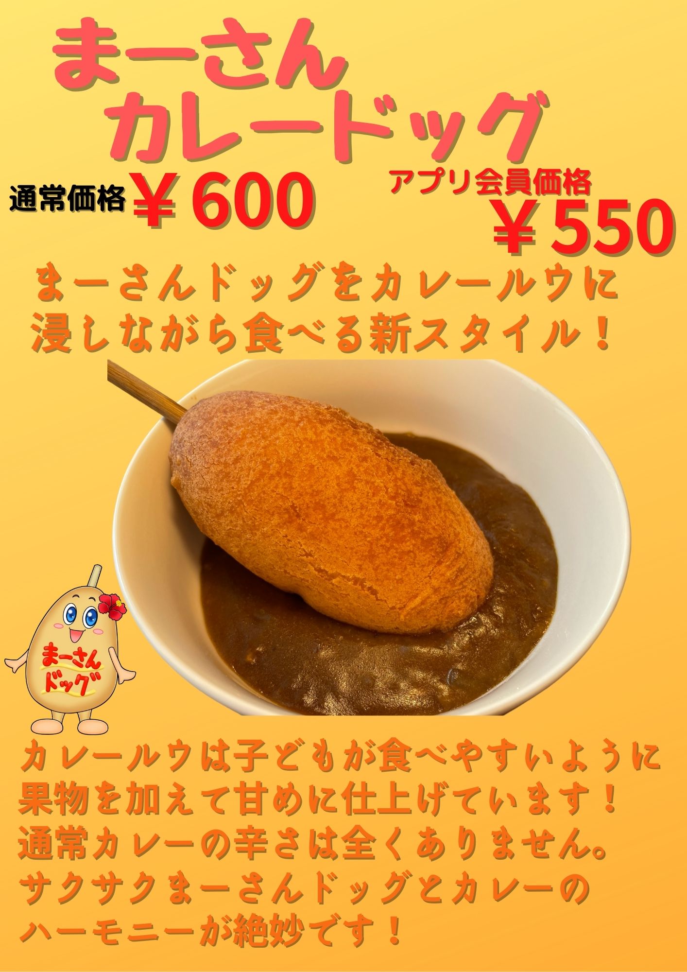 先月のメルマガでお知らせした「まーさんドッグ カレー味」を上記の2件のイベントで試験販売します❗️