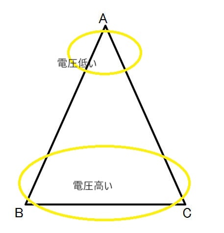 この底辺部分と頂点部分で起こる電圧さによって、電圧の高い方から低い方に向かって電気が流れるのです