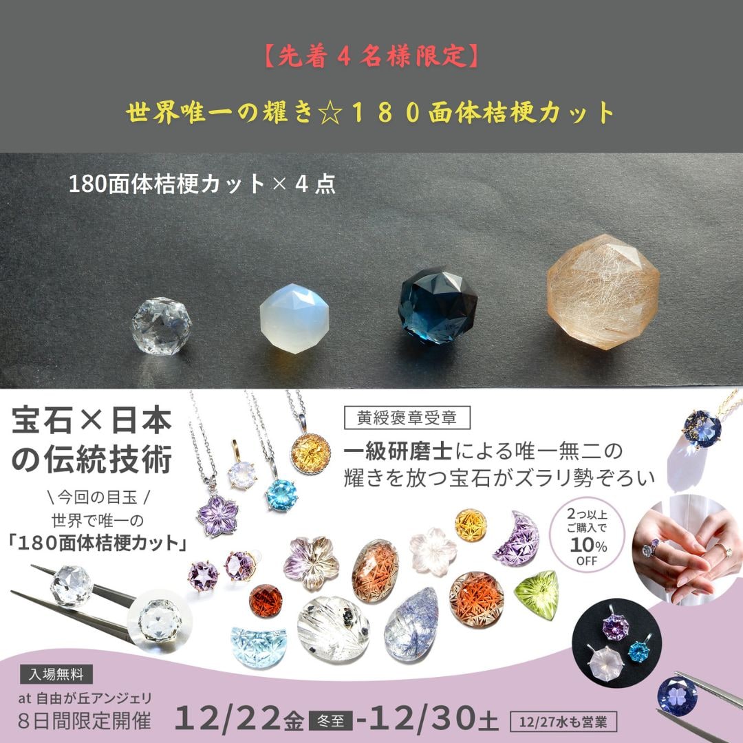 何かすごいか!というと、目玉は、ズバリ、黄綬褒章受章の現代の名工 清水幸雄氏による「180面体桔梗カット」は世界で唯一の一級品が4点入荷すること!!