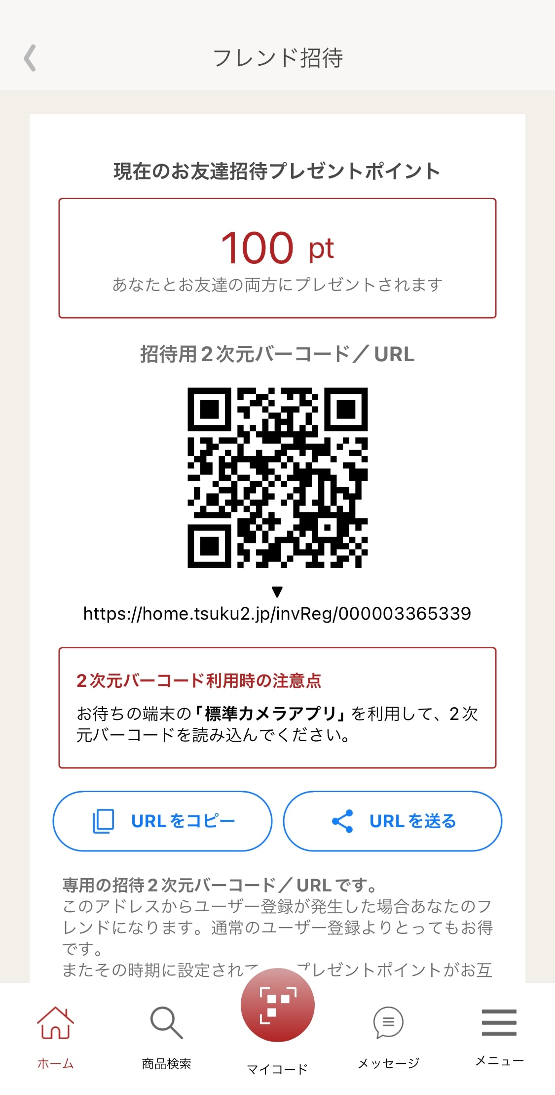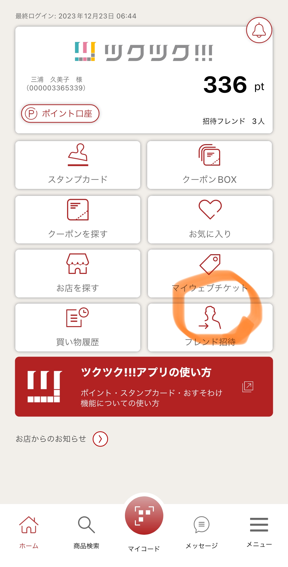 みなさんのツクツク『ツ』のアプリを開いて頂き、マイページの右下にある『フレンド招待』をお友達に読み込んでもらうと