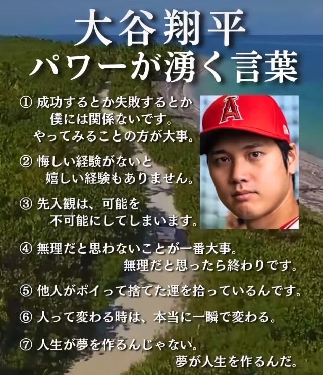 今日は日曜日でもあるので、ご家族やご友人とパーティー開催のかたも多いのではないかと思います。先日、私が自然療法を志すきっかけとなった、医師としての大先輩になられます上馬塲和夫先生(日本のアーユルヴェーダの第一人者)から、大谷翔平語録を送っていいただきましたので、皆様にシェアしたいと思います。