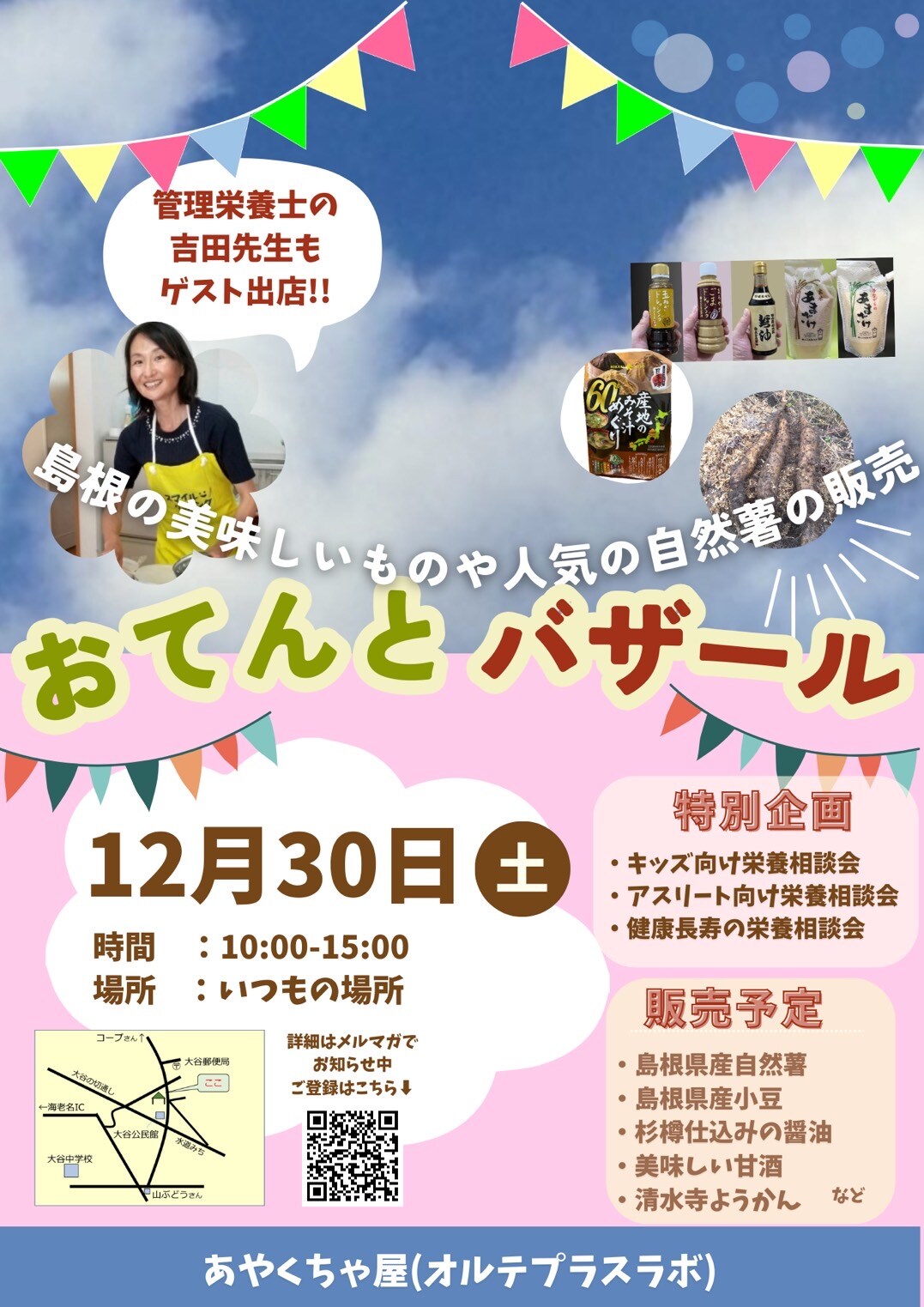 今回のおてんとバザールでは、いずれのお店でも1pt=1円のツクツク!!!ポイントが利用できます。お時間があれば、あらかじめツクツク!!!のアカウント登録をお済ませください。あやくちゃ屋および敦まるのメルマガ登録をセットで行っていただいたお客様にはプレゼントをご用意しております。ぜひゲットしてください。