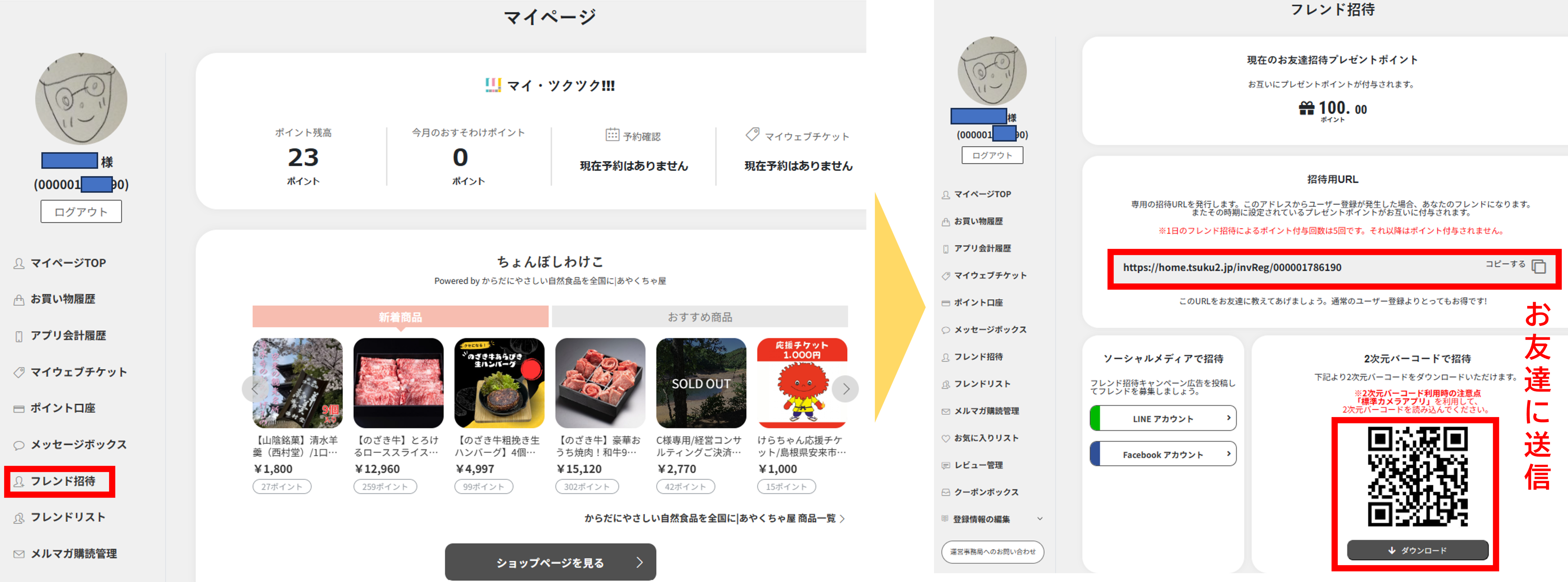 さらに、ツクツク!!!をお友達に教えてあげる(フレンド招待)と、お客様にもお友達にも嬉しい、それぞれ100ptプレゼントがあります。アカウント登録を済ませれば以下の手順でフレンド招待ができますので、お得にポイントをためておてんとバザールにお越しください。