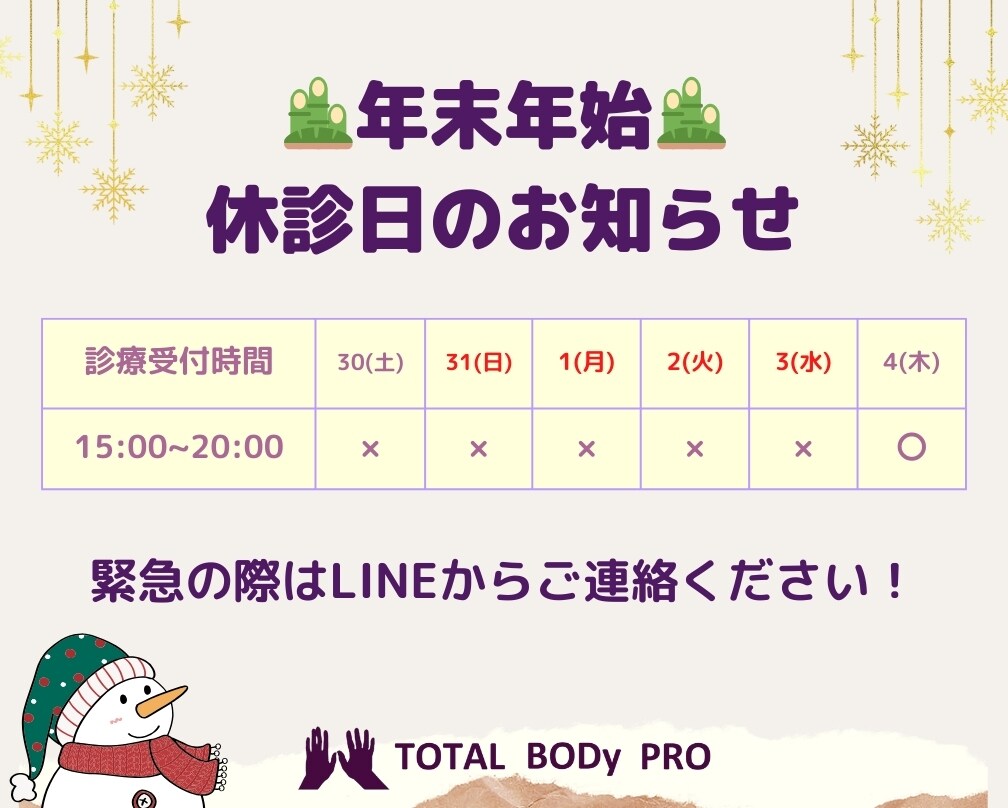 【🎍年末年始🎍休診日のお知らせ】12/29(金)〜1/3(水)まで休診とさせていただきます。