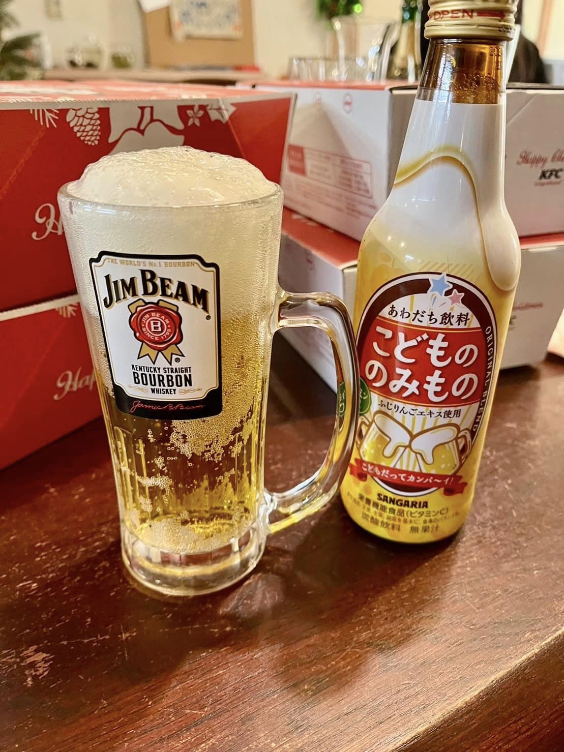 ピアノを練習して皆んなでクリスマスソングを歌って、お酒にしか見えない飲み物で一体感!?を味わって。(…ビムビームのジョッキがあることのほうが驚きましたがw)