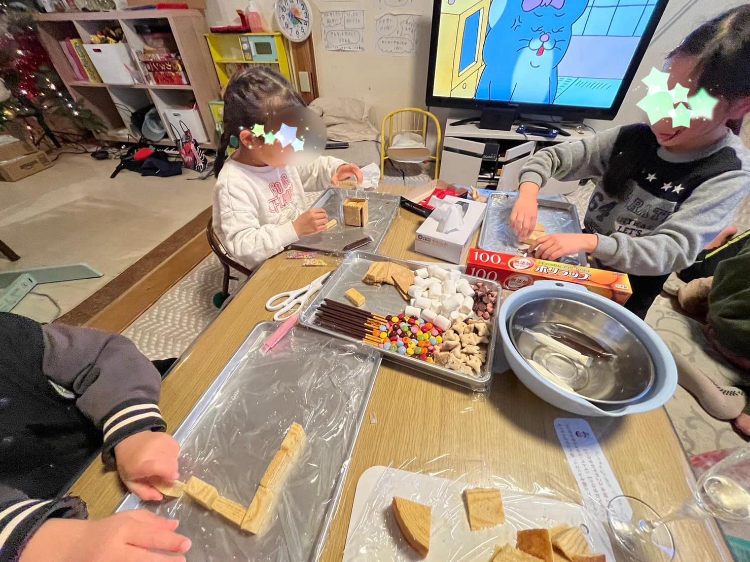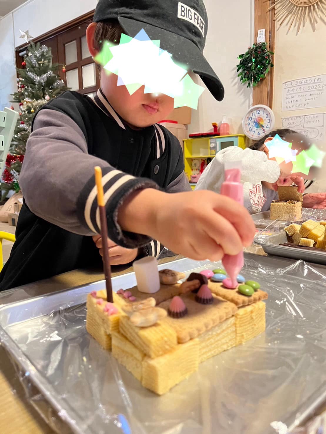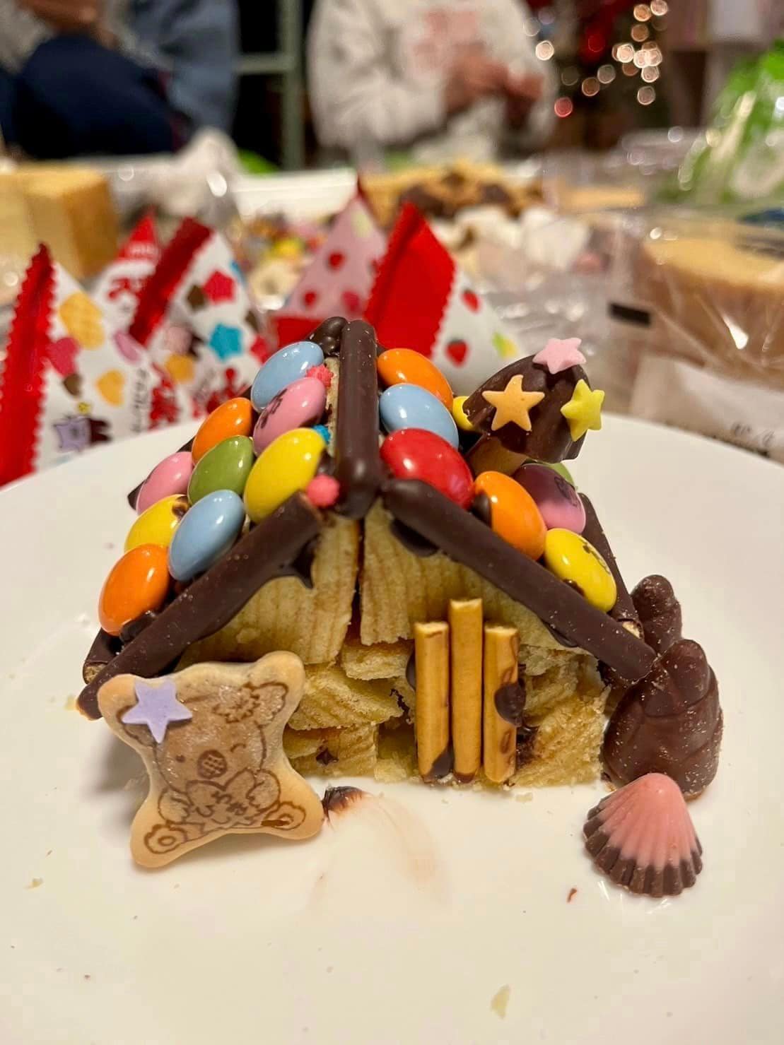 ご提供いただいたバウムクーヘンでお菓子の家づくり。