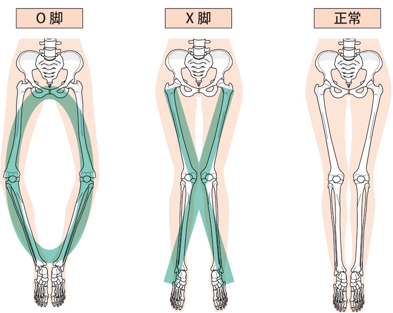 踵が内側に倒れてしまうとO脚になり、膝の内側が痛みます。逆に踵が外側に倒れるX脚となり、膝の外側が痛くなります。
