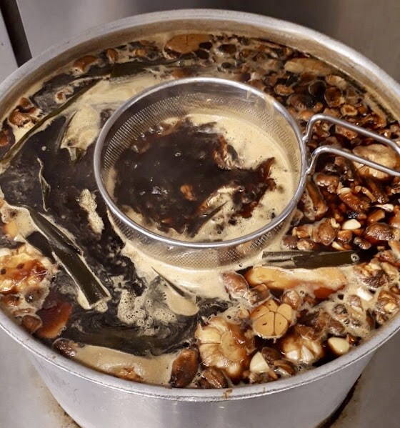 煮干しや鰹節、その他の乾物を入れ、じっくりと火入れを行うことでうま味が溶け込んだ醤油ダレが完成します✨