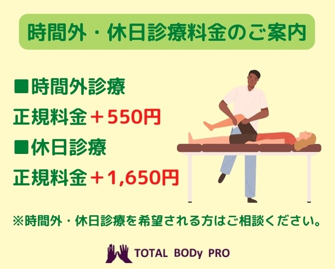 『時間外・休日診療料金のご案内』スポーツ整体院 TOTAL BODy PRO