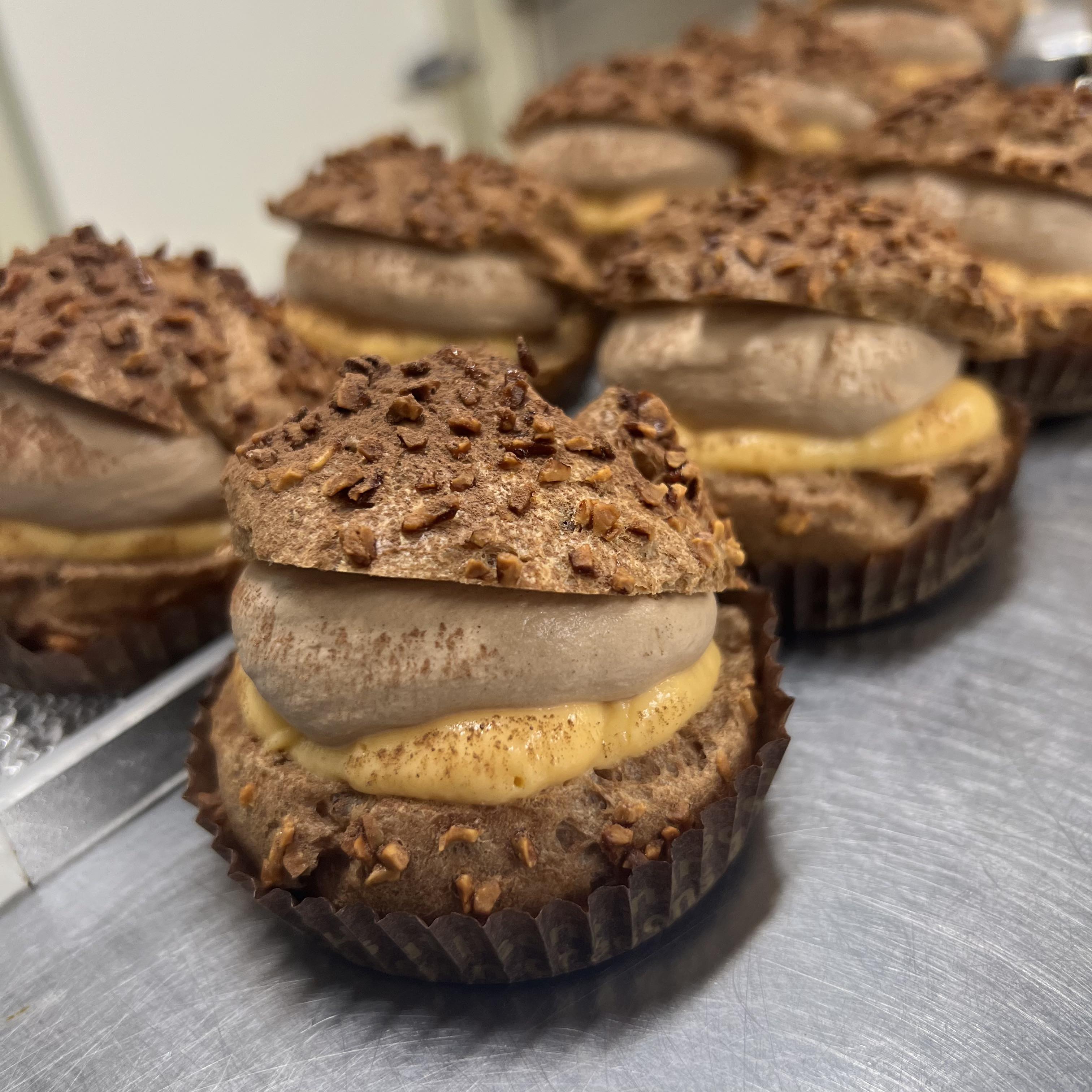 カスタードクリームとショコラクリームの2層仕立て、中にはさっぱり とろ~っとしたガナッシュ‼