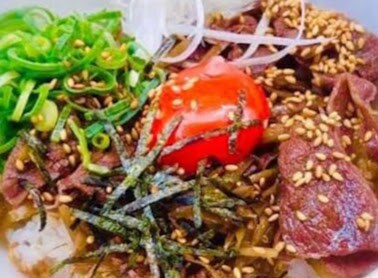 牛肉、キンピラゴボウ、葱、海苔、金胡麻、濃厚卵、