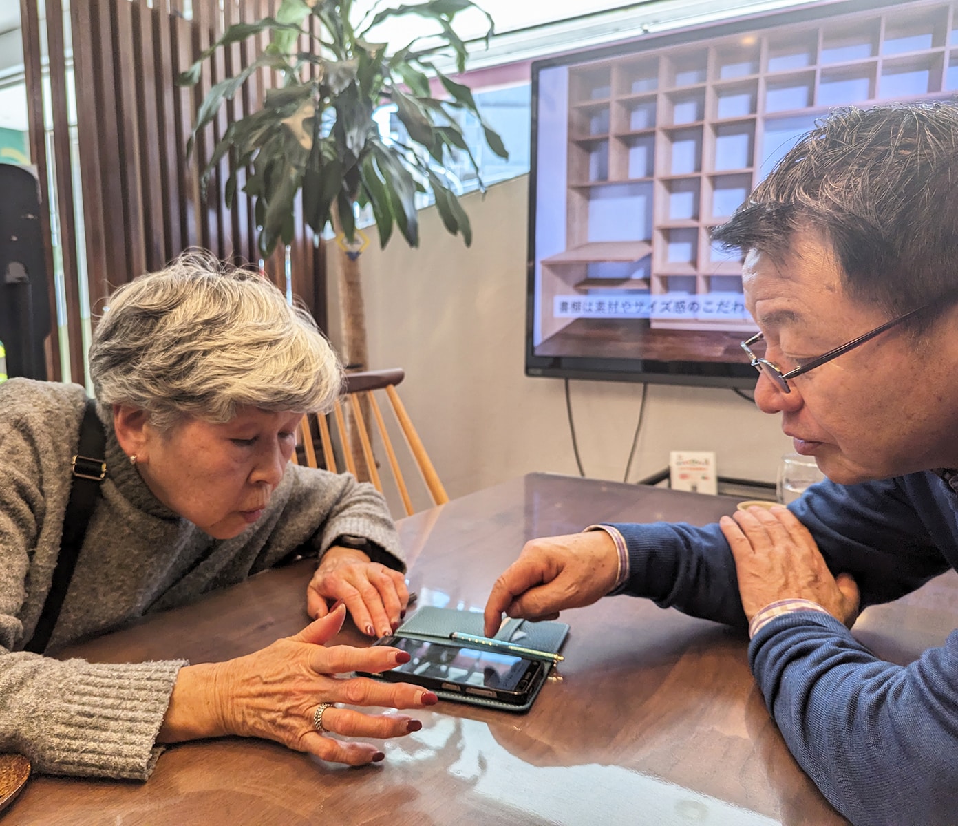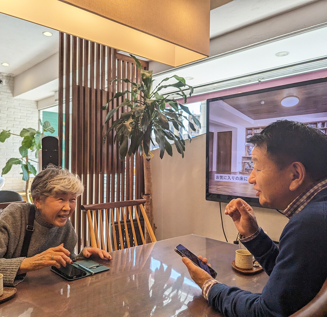 ▲貯まったツクツクポイントの確認方法や、取材ついでにスマホの楽しみ方を弊社北川が岩岡様に伝授しているところ