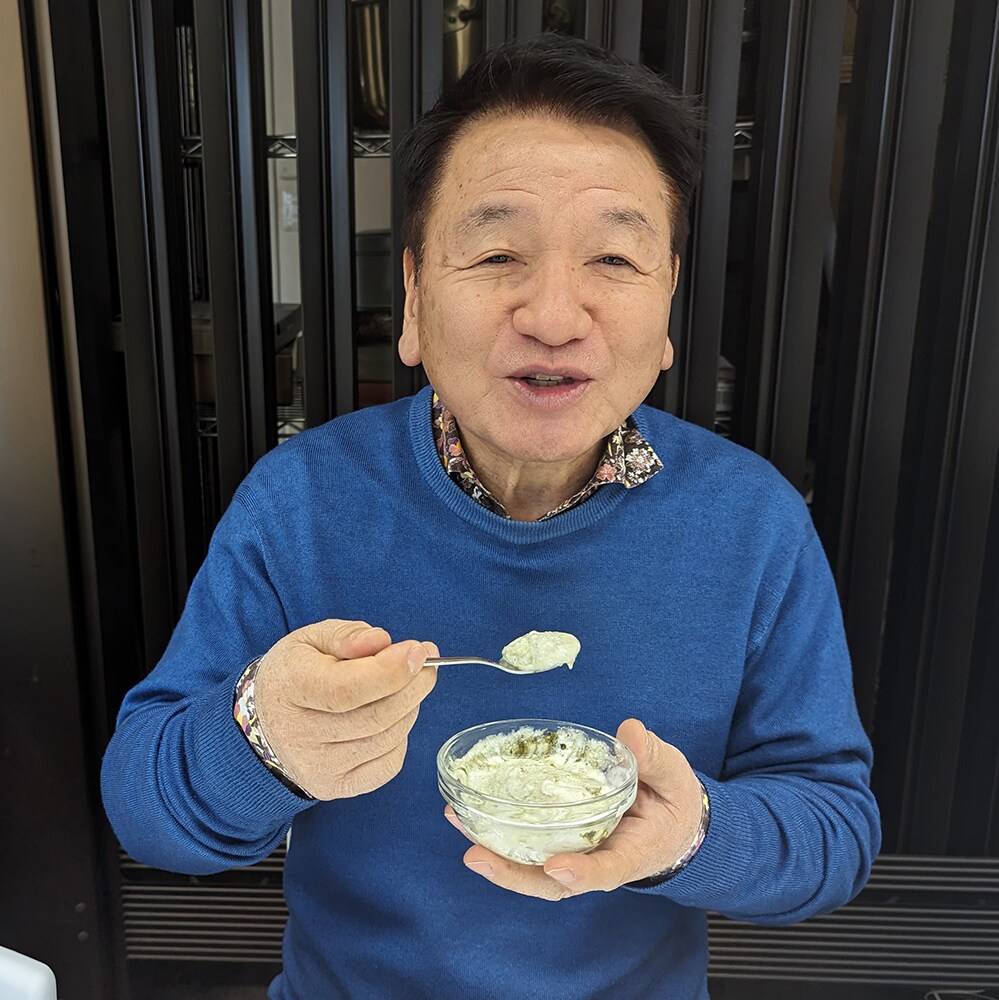 普通の青汁のような苦みなどがないので普段は簡単に水で割って飲んでいますが、今回は岩岡様から教えていただいたヨーグルトに混ぜる方法で試食してみました。