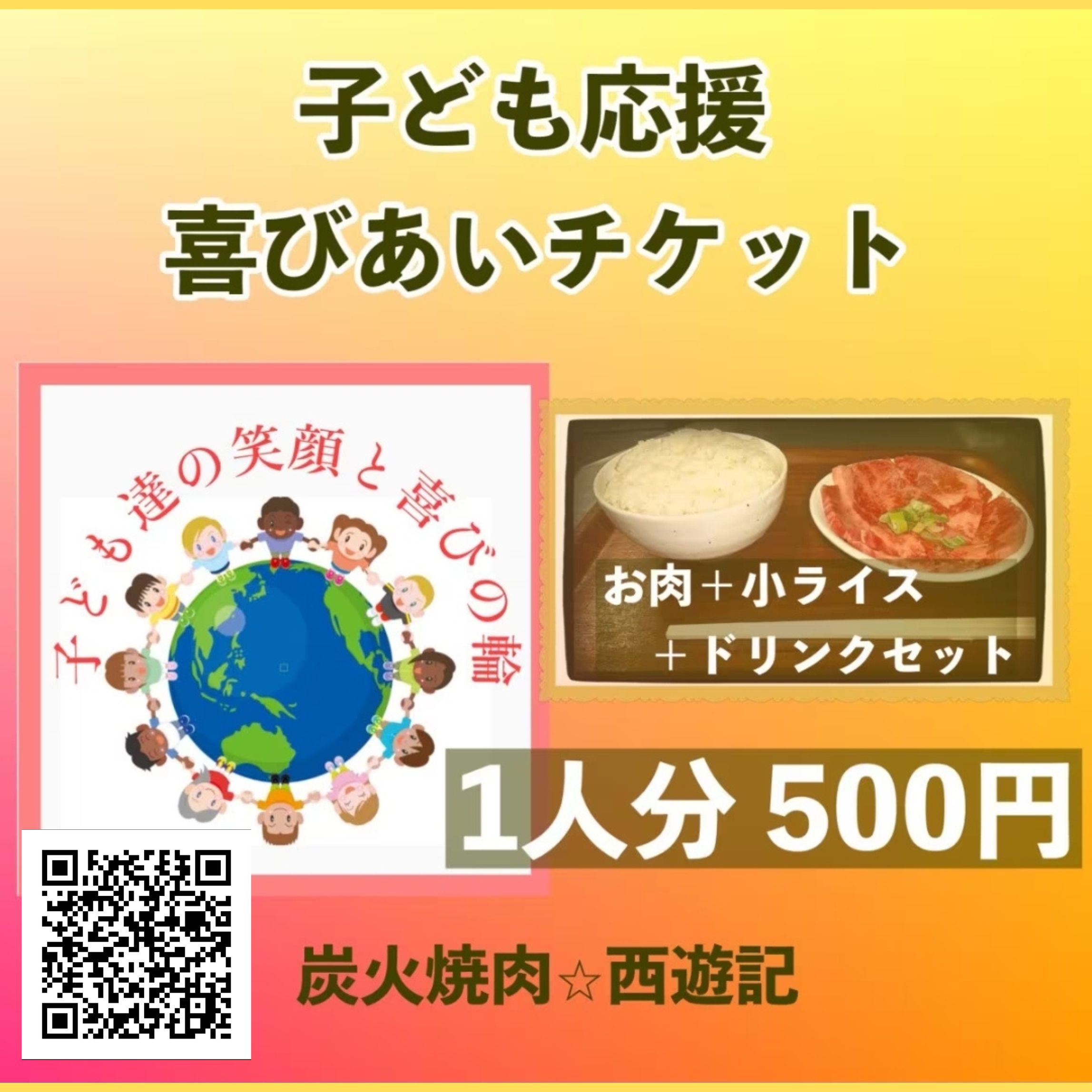 こども応援⭐︎喜びあいチケットを1枚ご購入頂くと、西遊記にご来店された【子ども1人分のお肉+小ライス+小ドリンクの応援セット】の提供にあてられます。