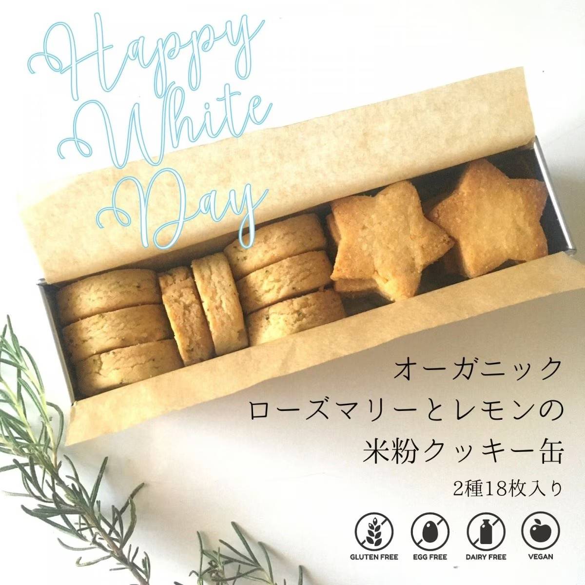 ホワイトデーのお返しに【オーガニックローズマリーとレモンの米粉クッキー缶(2種18枚入り) 】/ 小麦粉・卵・乳製品不使用 /3月5日までのご注文で3月10日前後の発送予定