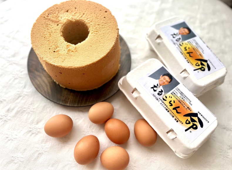 抗酸化力がビタミンEの7,000倍という天然アミノ酸「エルゴチオネイン」を豊富に含んだ世界初のたまご、えるごらん命をたっぷり使用したシフォンケーキです。