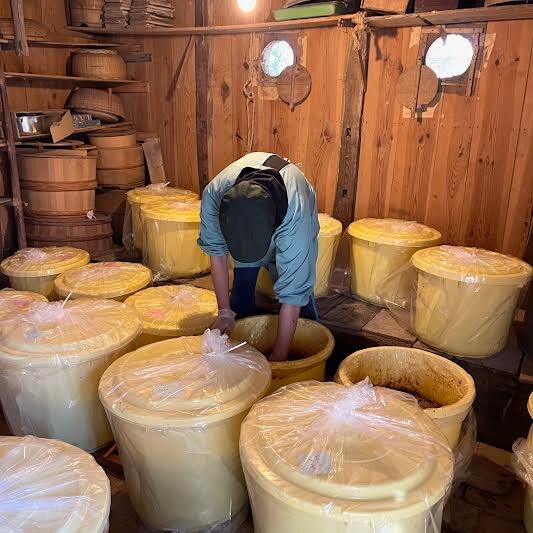 自家製麹と自社農園で育てた川北黒大豆の規格外品を用いて、じっくり蔵で熟成させた手づくり味噌です。