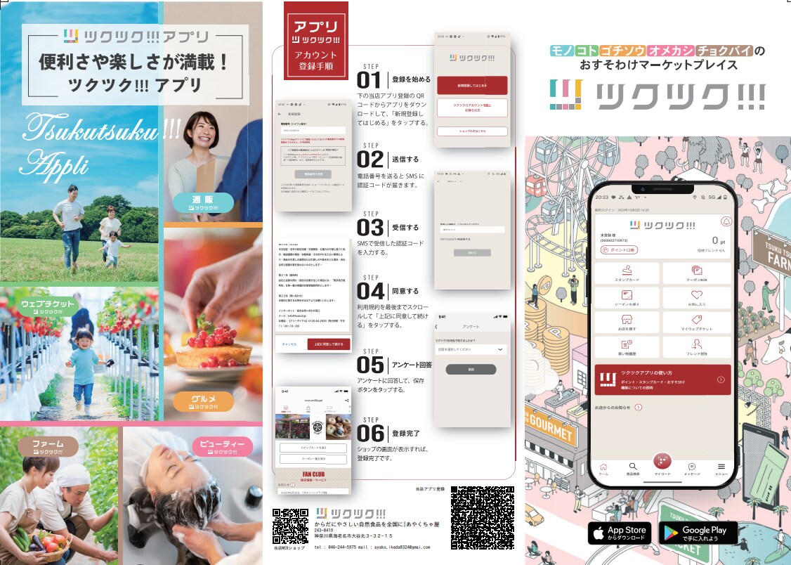 あやくちゃ屋が出店するマルシェでは、ツクツク!!!アプリをご利用のお客様をえこひいきします。アプリユーザー限定の特価またはボーナスポイント還元でお買い物をお楽しみいただけます!無料のアプリ登録はこちらから簡単に行えます。