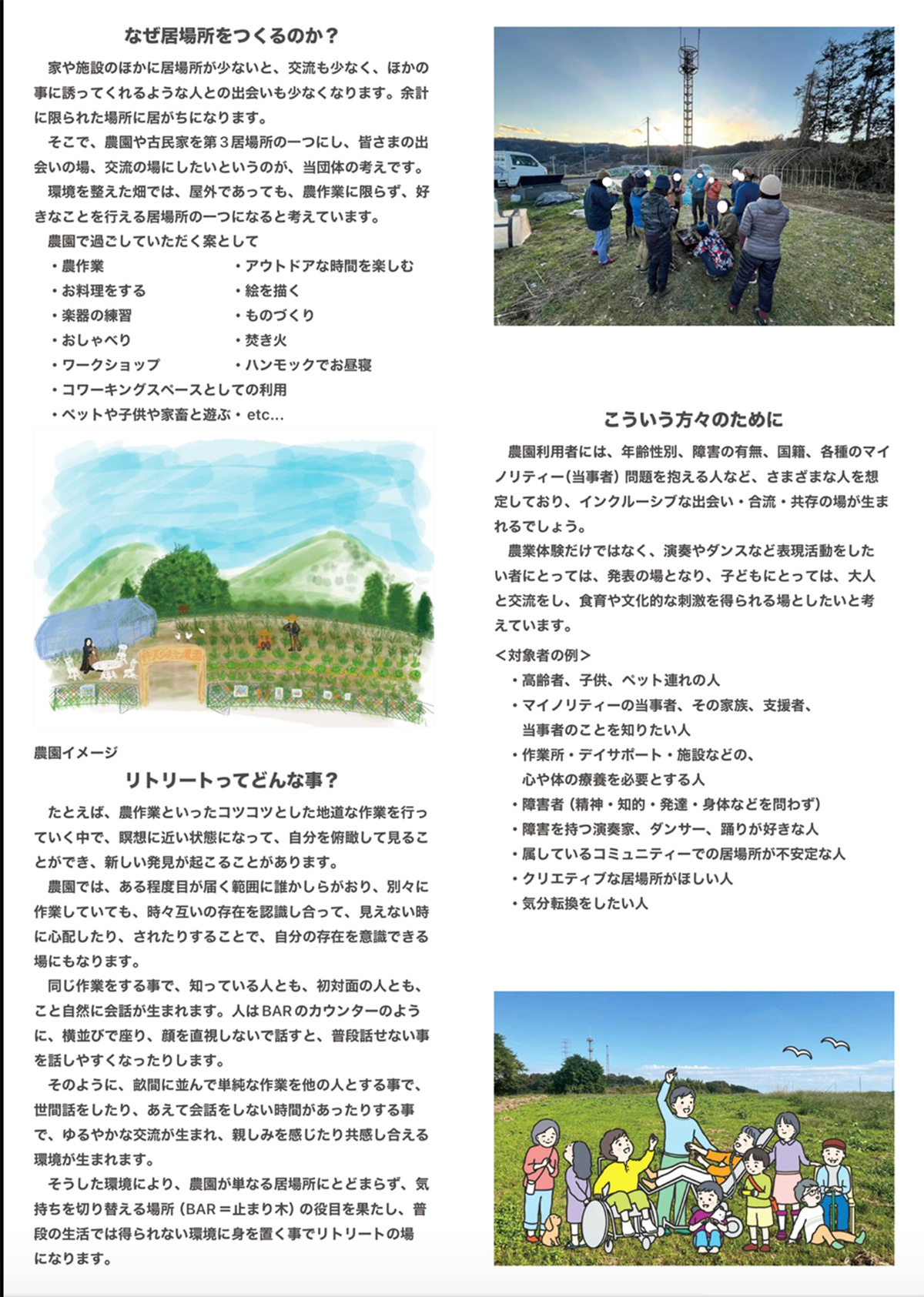 高齢者、障害者、子供、ペット連れの方など、利用者が安心して農業体験や畑イベントに参加できる農園を作りたい!