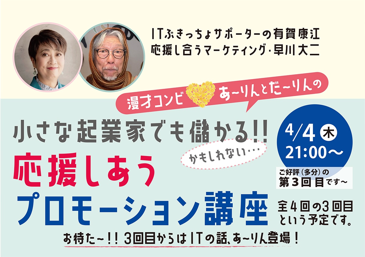 無駄なお金をかけず、ITを味方にし、身の丈にあった進め方で「事業としてちゃんと収益をあげるやり方」を具体的な事例を交えお話させていただきます。抱腹絶倒、漫才コンビのこのお話、お友達もお誘いの上ぜひ!!