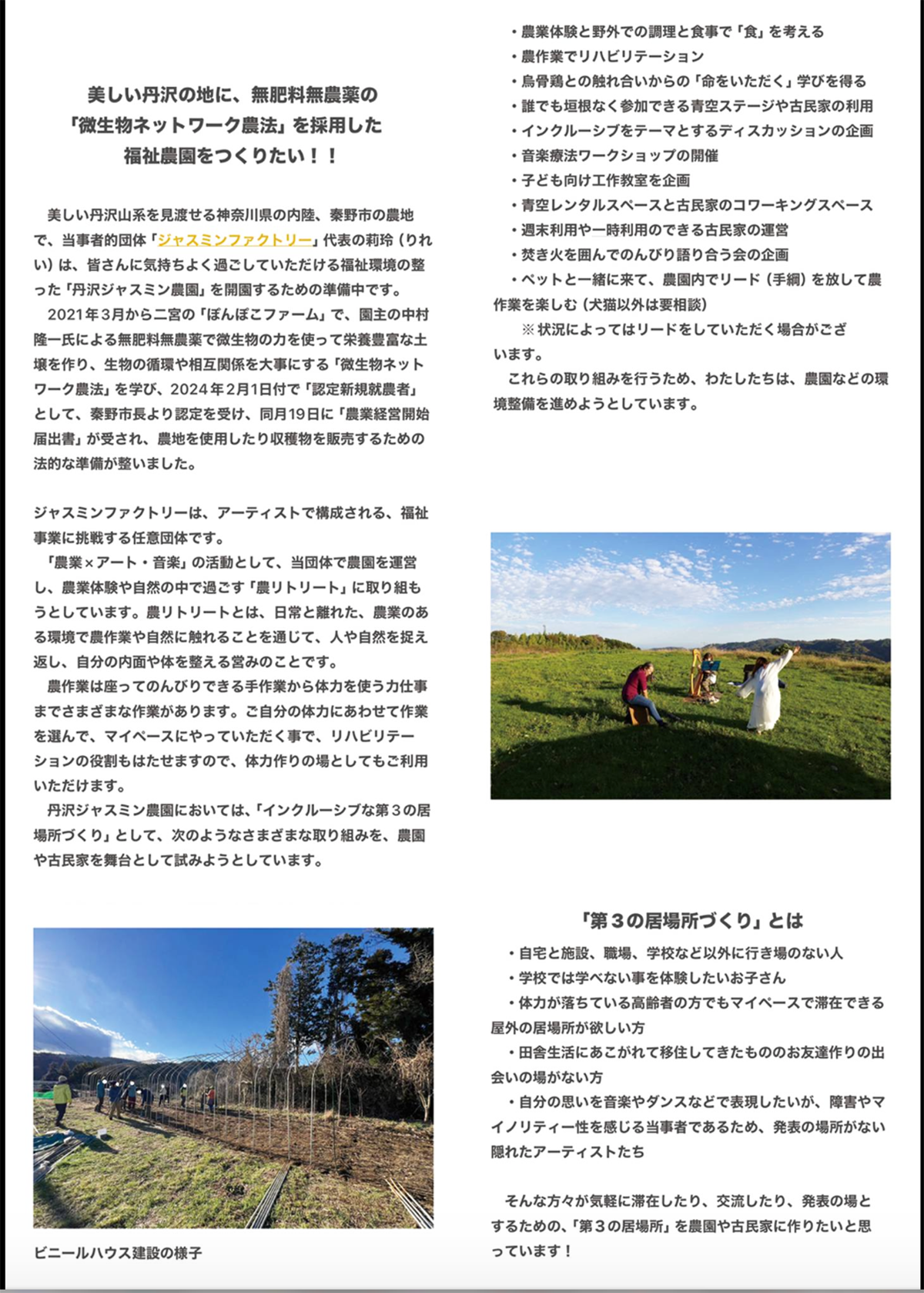 そんな方々が気軽に滞在したり、交流したり、発表の場とするための、「第3の居場所」を農園や古民家に作りたいと思っています!
