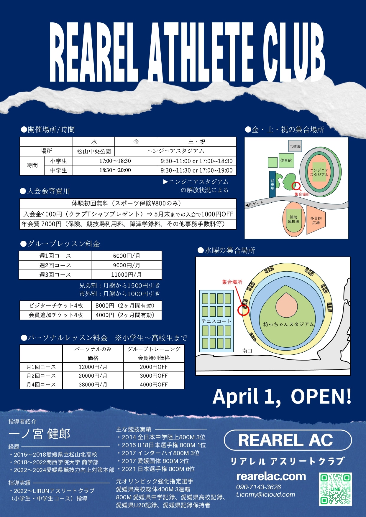 松山院(TOTAL BODy PRO)に中学3年からメンテナンスで通っている一ノ宮健郎くんが4月から陸上教室(REAREL AC)をスタートします。