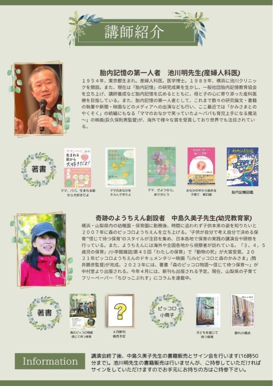 4/28(日)池川明先生&中島久美子先生 対談講演会開催♪