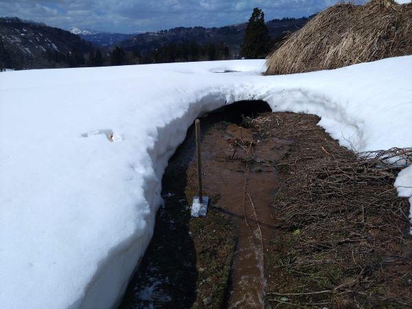 雪解けが進む棚田の水路では落ち葉などのゴミがつかえ、溢れた雪解け水が水路や田んぼ等の決壊を引きお越します。