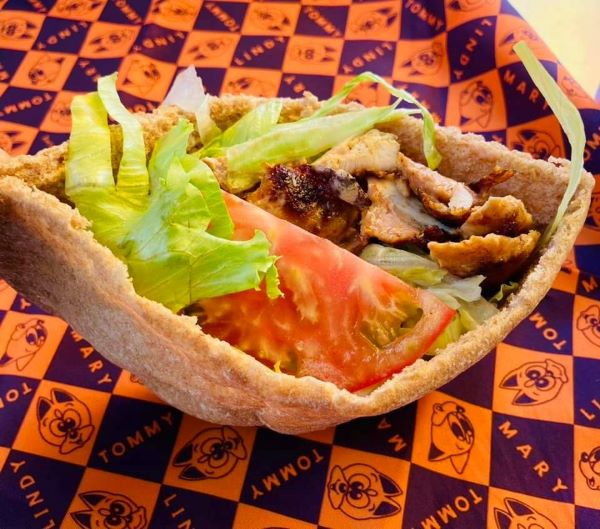 肉を回転しながら焼いて,剃りおろしたお肉と野菜をパンに挟んでヘルシーなサンドイッチです。