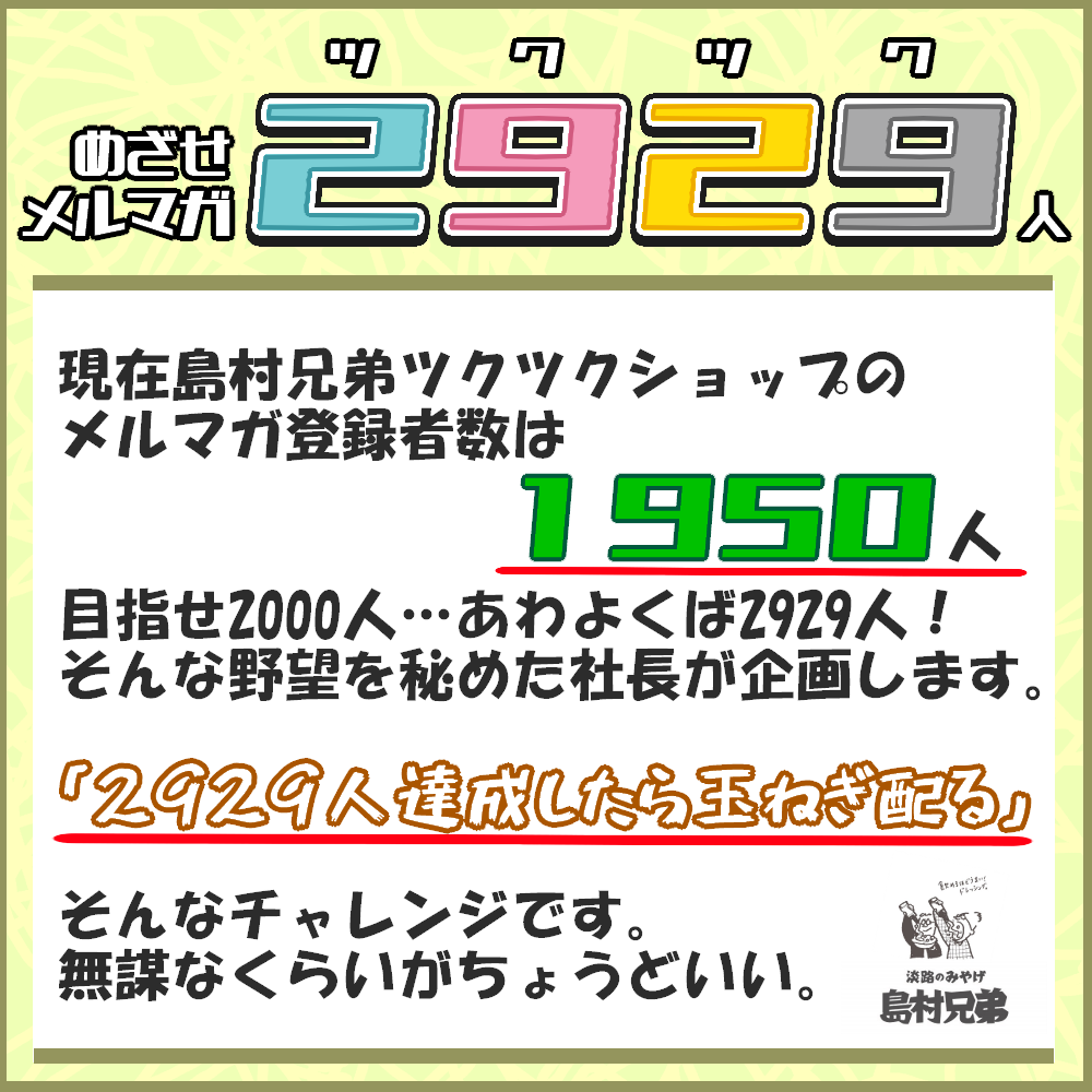 現在島村兄弟ツクツクショップではメルマガ登録者数2929人を目指しまして、キャンペーンを行っています。