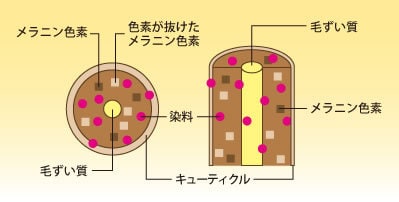 日本人の毛髪は②のメラニン色素が濃いので、明るく染めようとすると