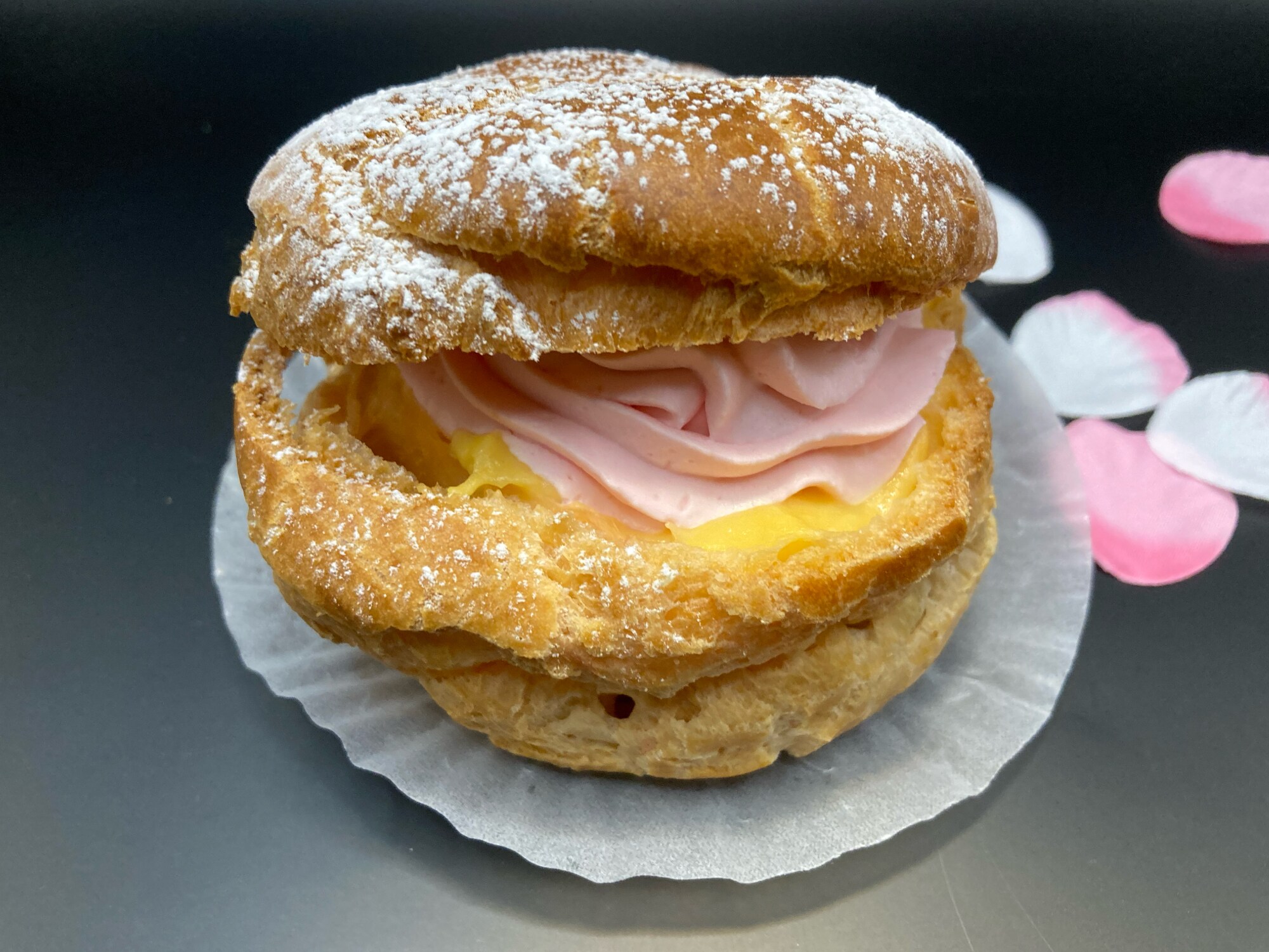 ほんのり桜風味のクリームと和テイストのカスタードクリームを使用した季節限定のシュークリームです。