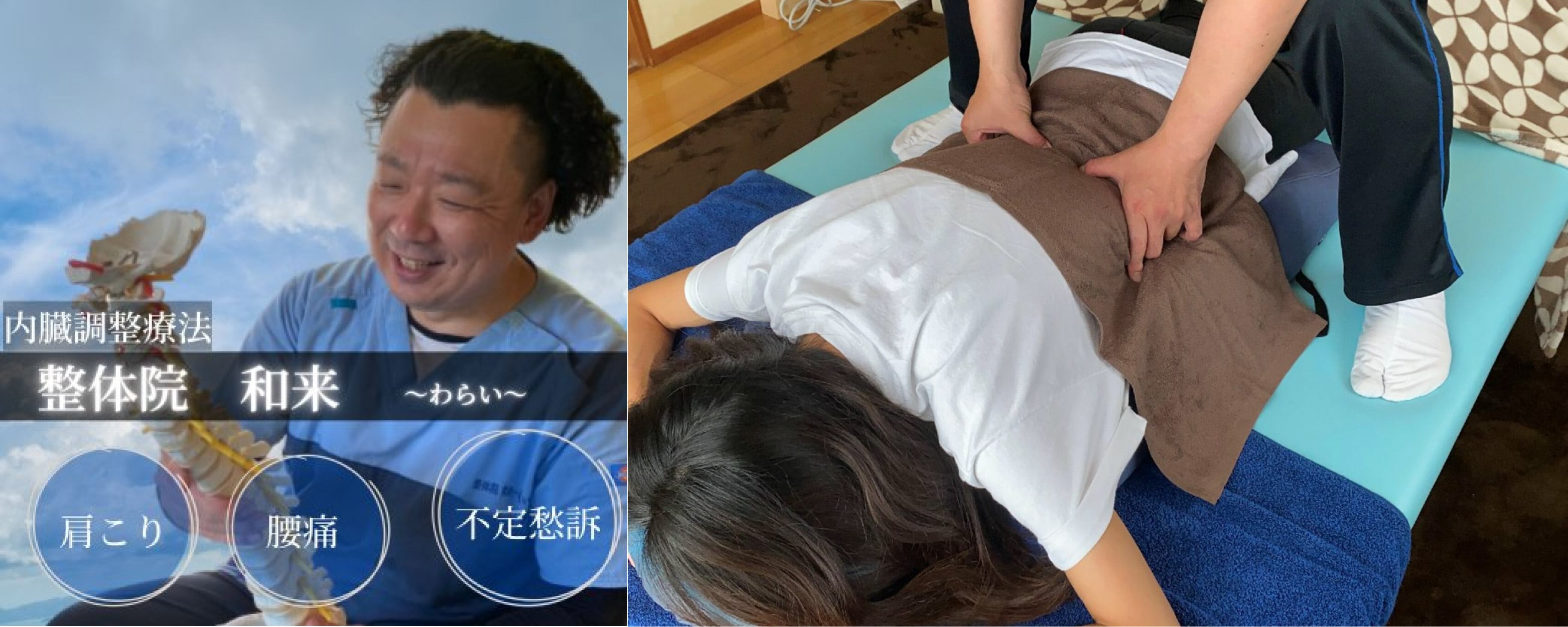 和来さんは「内臓調整療法」という手技療法を用いて、腰痛・肩こり・関節痛・坐骨神経痛などの不快症状だけでなく、頭痛・不眠・パニック障害などの自律神経の乱れからくる不調、PMSや整理不順など、女性特有のお悩み、胸やけ・SIBO・過敏性腸症候群といった各臓器の不調、猫背・ストレートネック・反り腰・骨盤の歪みなど、骨格矯正もしてくれます。