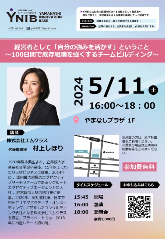 一般社団法人山梨イノベーションベース月例会【経営者として「自分の強みを活かす」ということ】参加者募集中♪