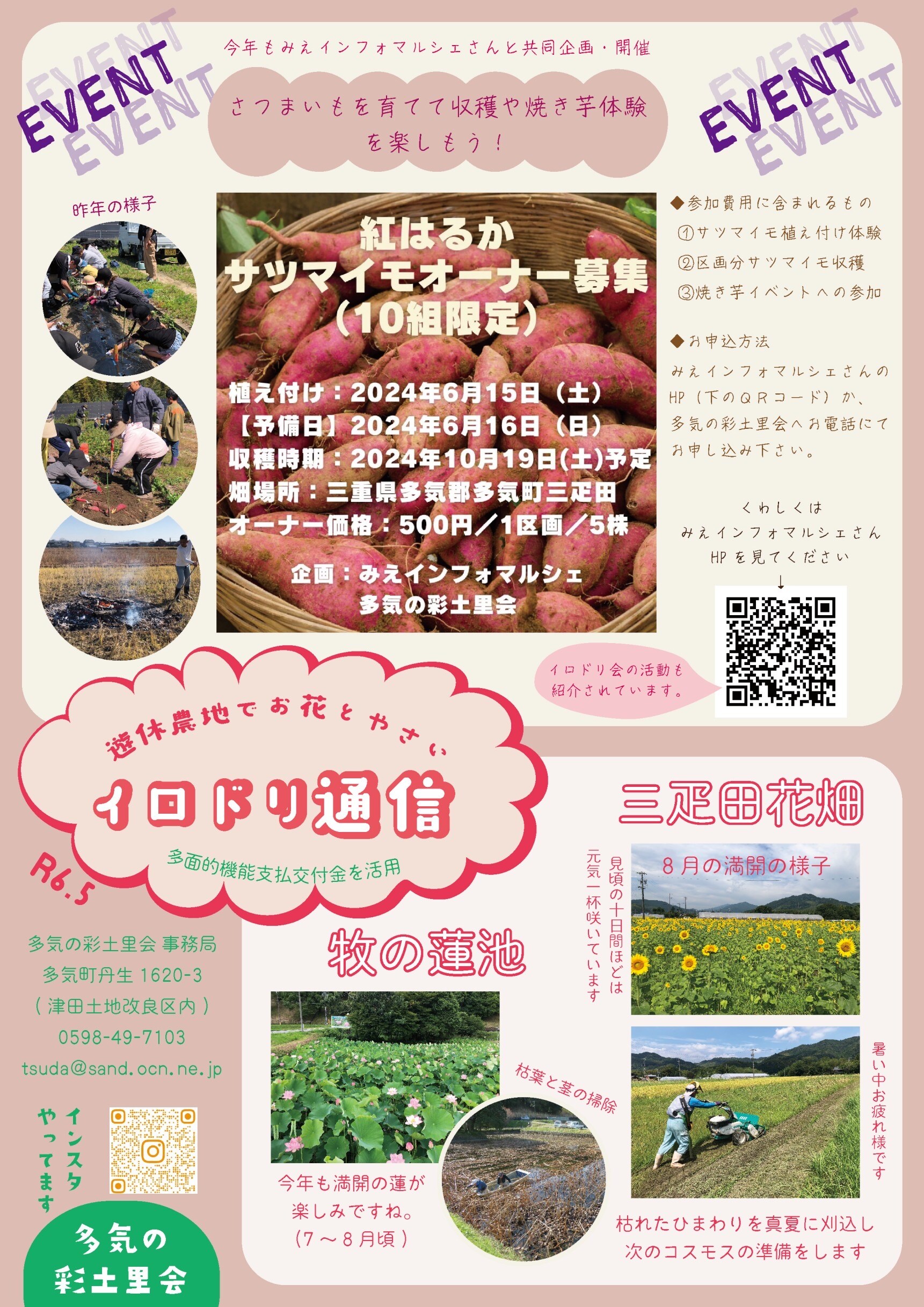 多気の彩土里会(タキノイロドリカイ)さんとの共同企画である、サツマイモオーナーの募集チラシが出来上がりました!