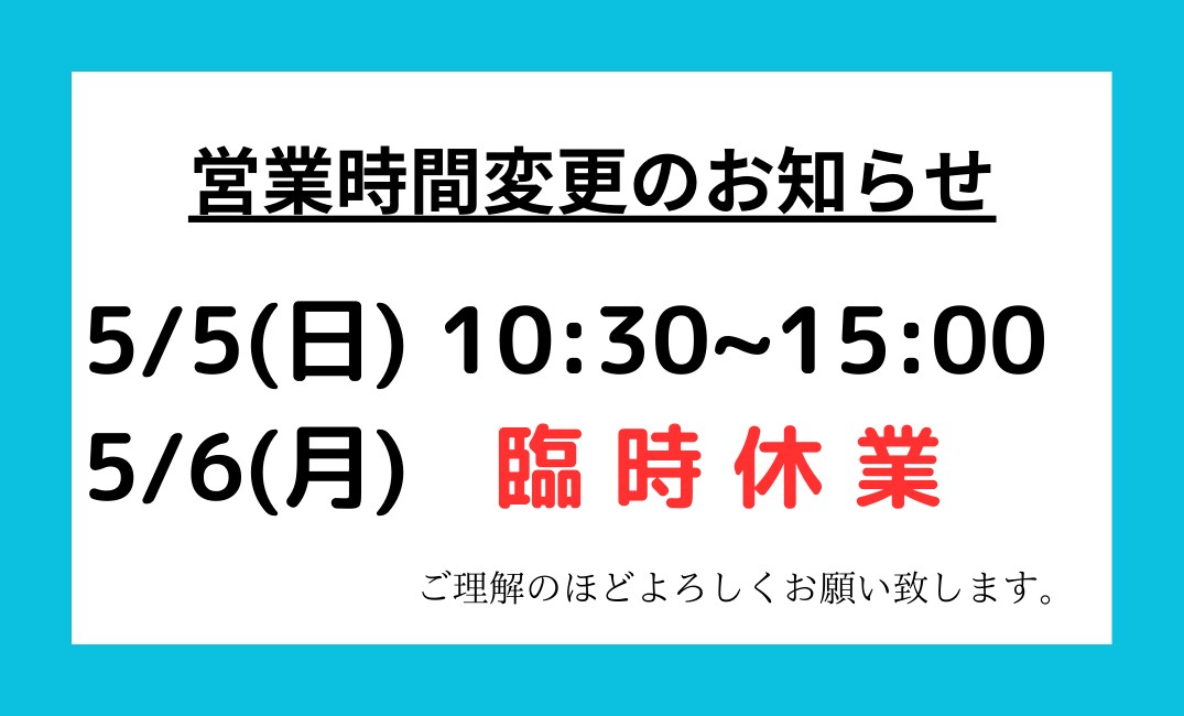 尚、本日5/5(日)は15:00までの営業とさせていただきます🙏