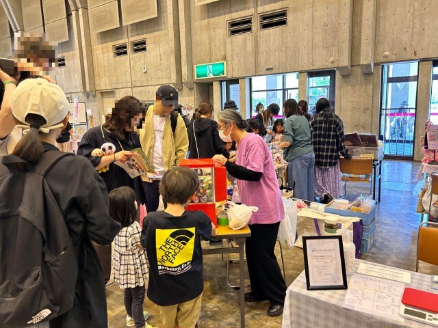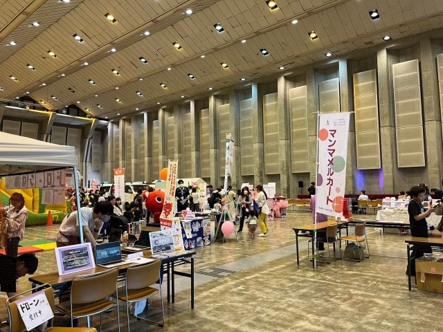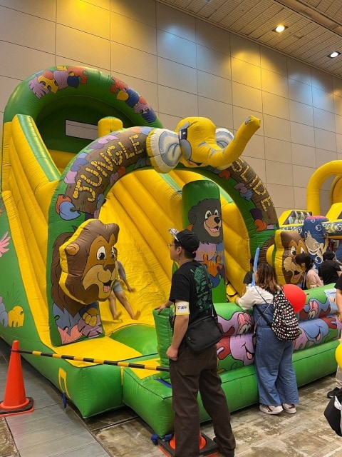 ふわふわドームを楽しむお子様、生活に役立つ情報を手にされる皆さま。