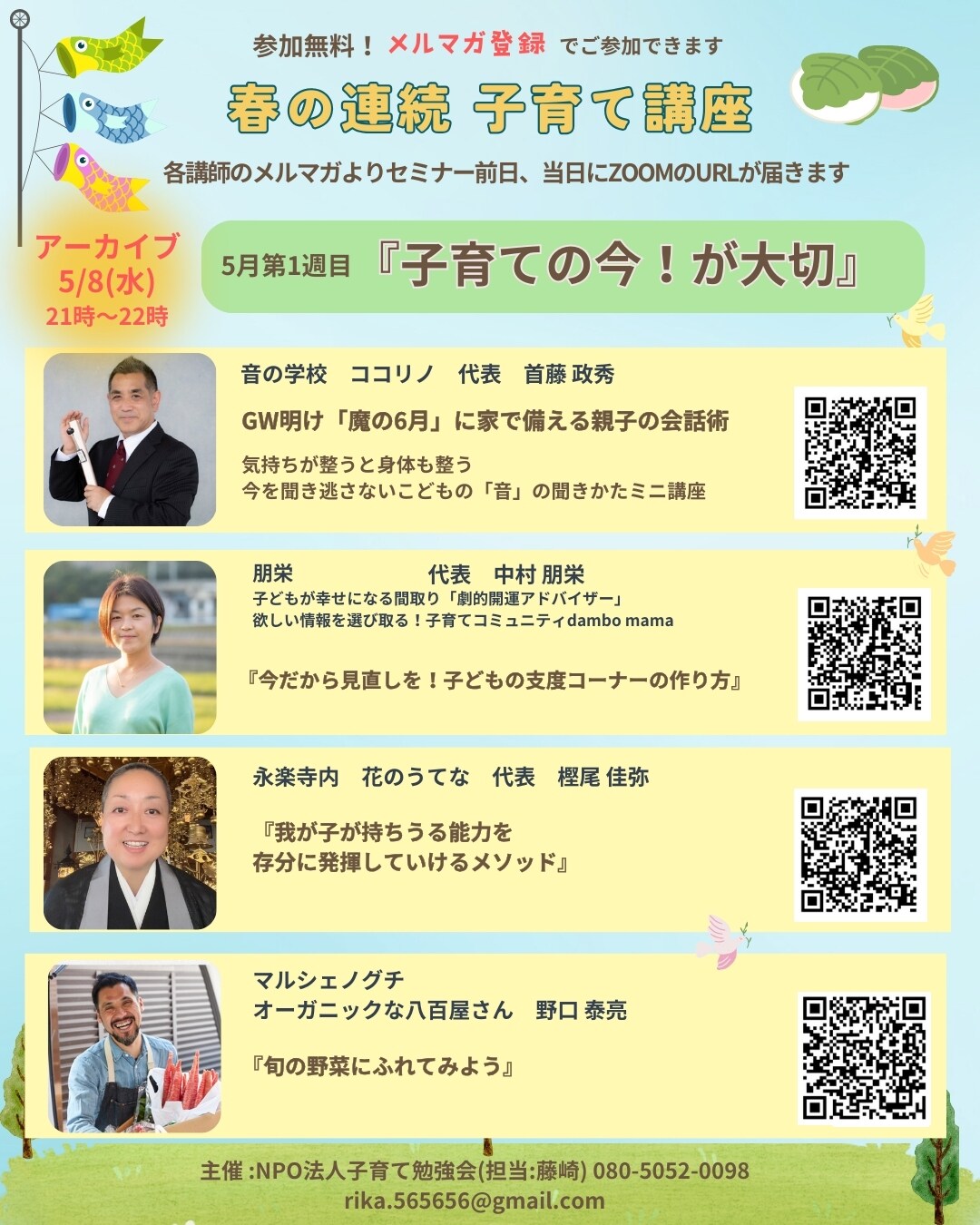 ゴールデンウィークが終わりました!いよいよ学校生活園生活が本格的に始まりましたね。子供たちの体や心ものびのび!私たち親ものんびりしてしまった!だからこそ!ゴールデンウィーク明けこそ!是非大切、新しい4人の先生方にお話をお願いしました!すごくいいお話❗