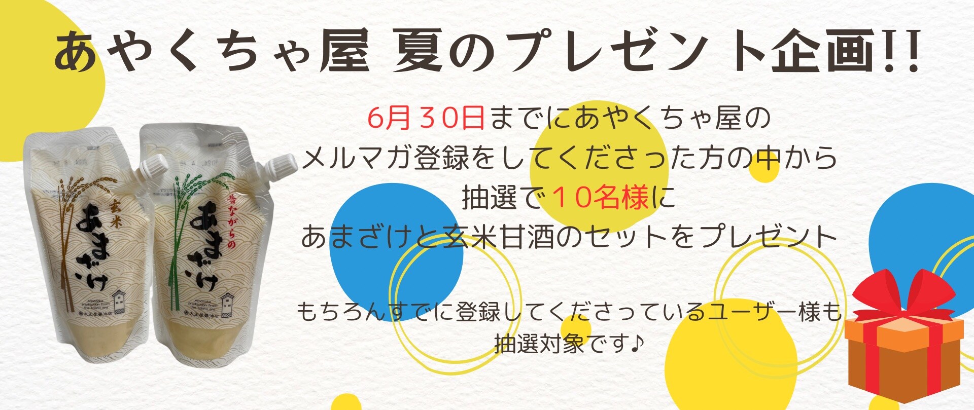 6月末までにあやくちゃ屋のメルマガ登録をしてくださった方の中から抽選で10名様に人気商品の「昔ながらのあまざけ」と「玄米あまざけ」をセットにしてプレゼントいたします!!もちろん送料もかかりません♪