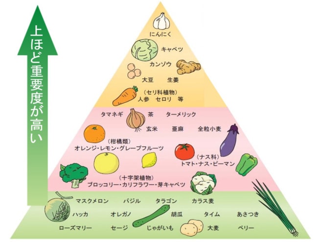 長年の疫学調査のデータに基づいて、ガン予防に効果のある食品および食品成分約40種類をピックアップし、その効果の重要度に合わせて作られたピラミッド型の図です。