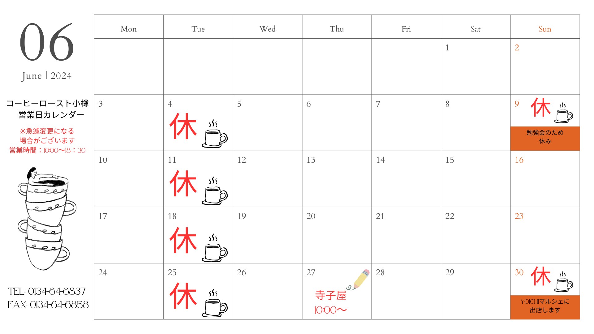 コーヒーロースト小樽 ☆6月のお知らせ☆