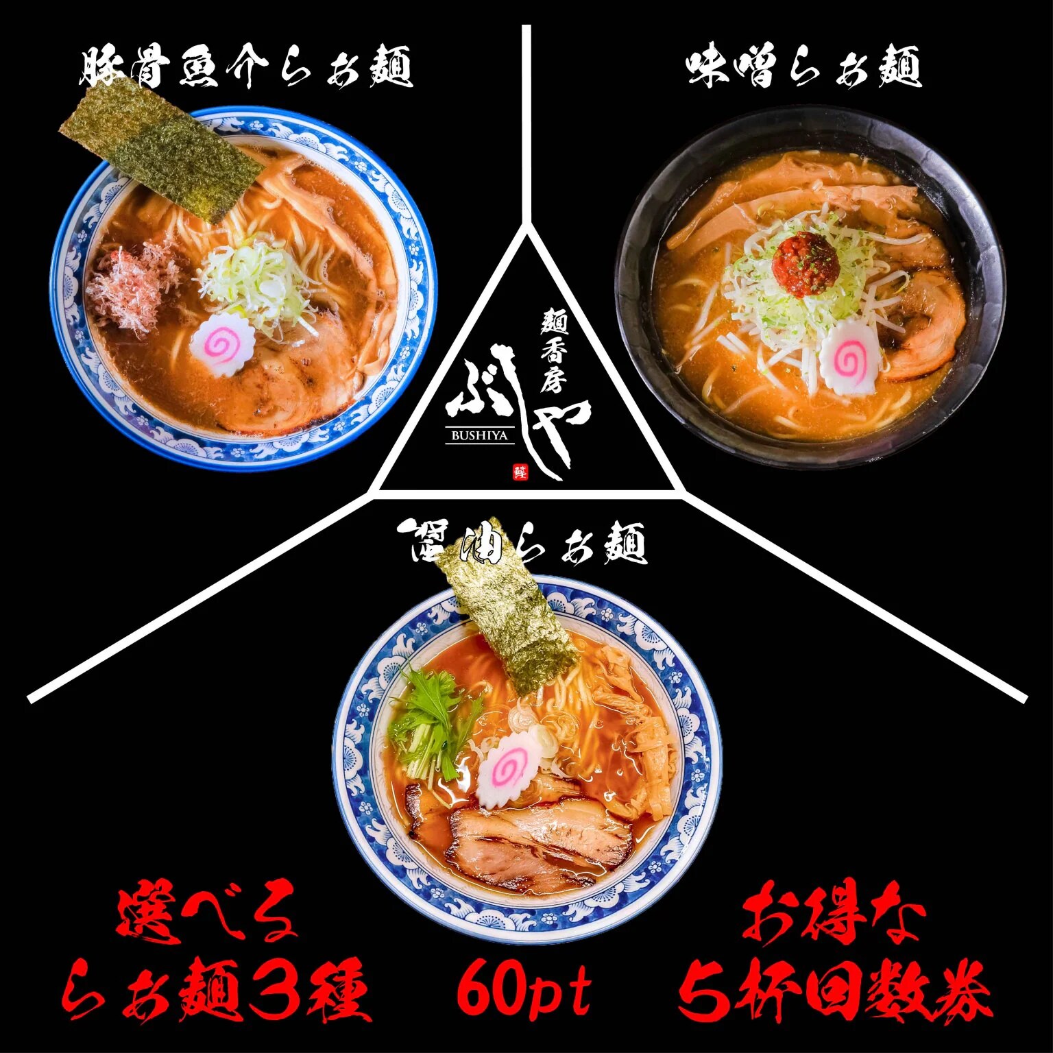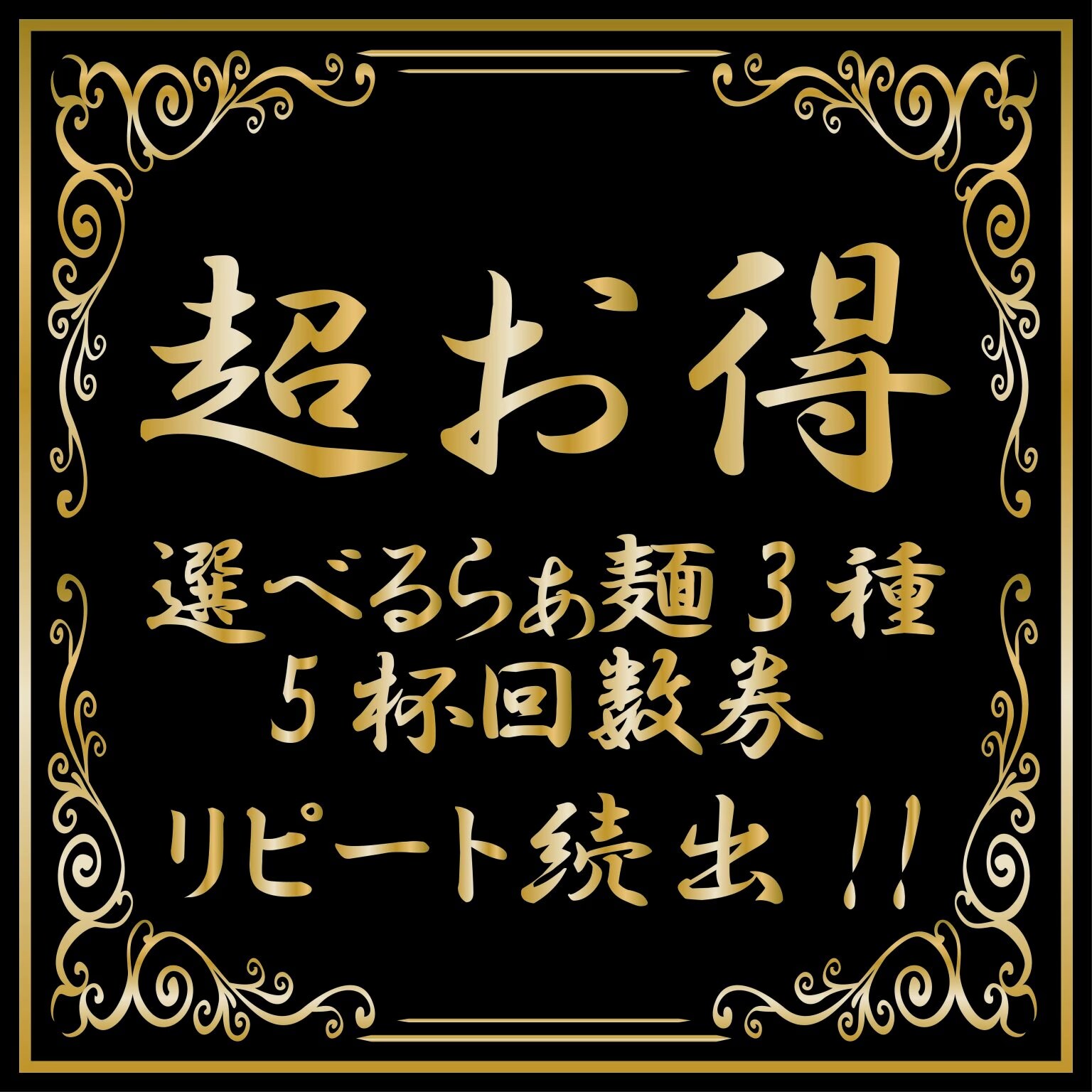 ・3種選べる!豚骨魚介らぁ麺・醤油らぁ麺・味噌らぁ麵 5杯分回数券