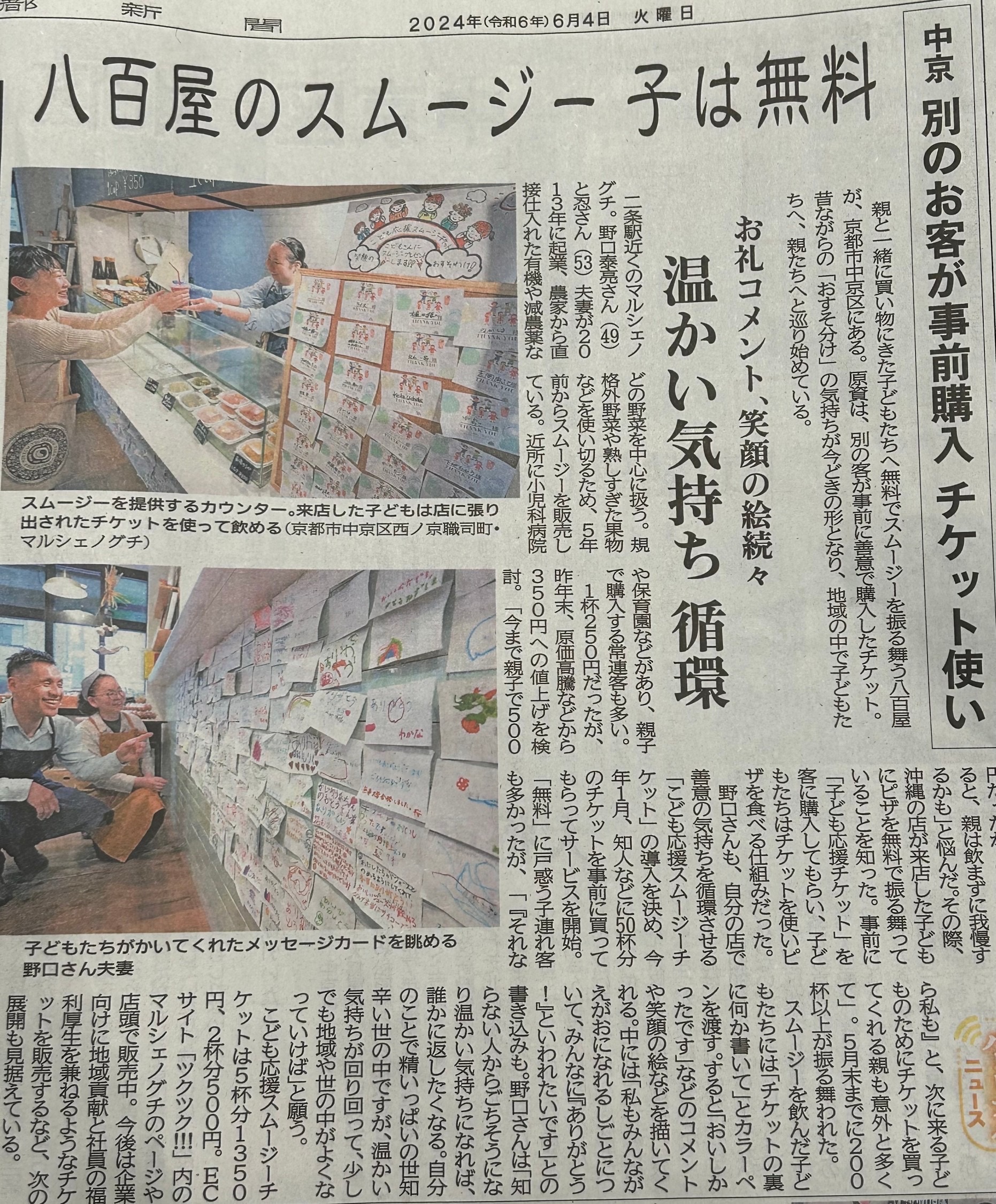 今朝の京都新聞さんにマルシェノグチがおこなっている事業『こども応援応援スムージーチケット』が掲載されましたー!